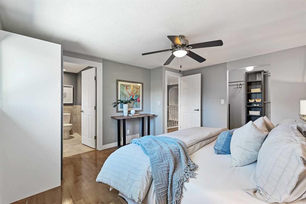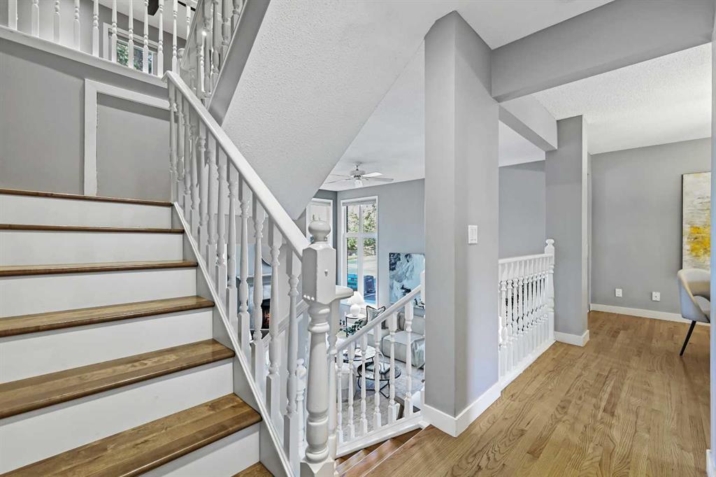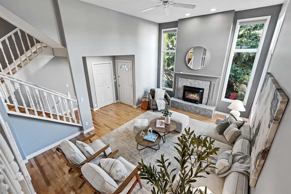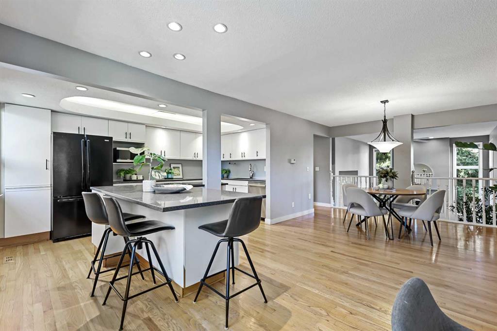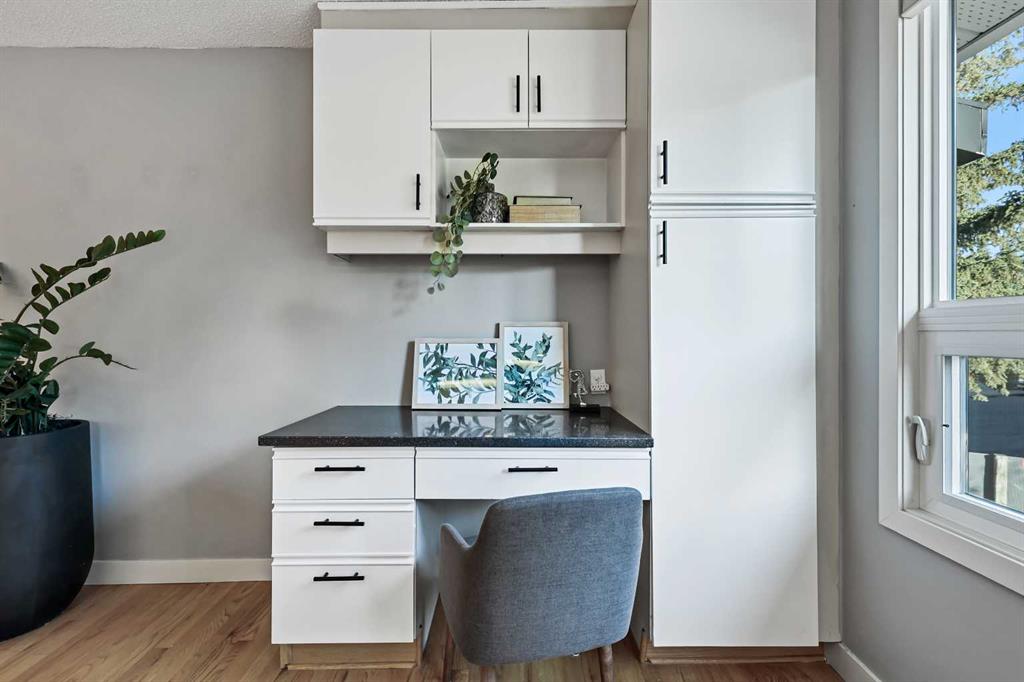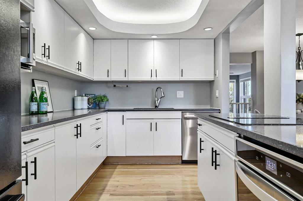 Welcome to this rare end-unit home offering timeless mid-century style and one of the community’s largest floor plans. With over 1,592 sq. ft. above grade plus an additional 590.91 sq. ft. of developed space below, this property combines character, comfort, and functionality. Inside, you’ll find a bright and airy open floor plan with soaring ceilings, a sun-filled south-facing living room, and a modern gas fireplace (convertible back to wood if desired). The updated kitchen is both stylish and practical, while the dining and living spaces flow beautifully for everyday living or entertaining. This home features 2 bedrooms plus a dedicated office, which could easily be converted back to a 3rd bedroom. The spacious owner’s suite fits a king-sized bed with ease and includes a walk-in closet with organizers and a 4-piece ensuite with double vanity and a large glass-enclosed shower with low-threshold entry. Thoughtful updates throughout include vinyl windows, high-efficiency furnace, hardwood, tile, and vinyl plank flooring, garburator, built-in vacuum, and newer built-in oven, dishwasher and washer/dryer. The roof was recently replaced in 2024. Step outside to the interlocking brick patio with a gas line for your BBQ—perfect for summer evenings. The patio can also be fenced for extra privacy or for pets. Pets are welcome (2 dogs/3 cats, with board approval). The complex itself offers resort-style amenities: an indoor pool, fitness centre, racquet court, and more. Enjoy peace of mind with a well run condo association and low monthly condo fees ($637.77) covering snow removal, yard work, and exterior building maintenance. Recently upgraded with Telus fiber optic wiring. The location is unbeatable—walking distance to bus stops and LRT, minutes from shopping, and with quick access to Crowchild, Sarcee, and Shaganappi Trails. The University of Calgary, Foothills and Children’s Hospitals, and downtown are all nearby. Lovingly maintained by the original owner, this home is professionally cleaned and move-in ready. See it... love it!