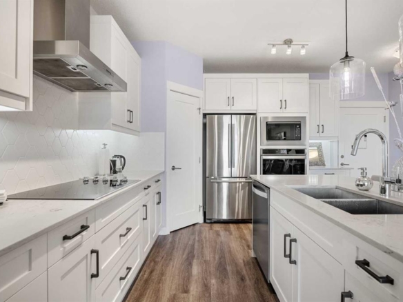 Experience sophisticated urban living in this beautifully upgraded 2-bedroom, 2-bathroom executive condo, ideally located with direct +15 access to GoodLife Fitness, London Drugs, top restaurants, and just steps from the boutiques and nightlife of 17th Avenue. Enjoy a highly walkable lifestyle with easy access to downtown and the Bow River Pathway system. This light-filled, modern residence features designer lighting, expansive windows, and an open-concept layout. The chef-inspired kitchen boasts a sleek peninsula island with eating bar, premium stainless steel appliances, classic subway tile backsplash, and timeless white cabinetry. An elegant dining area flows into the spacious living room, complete with a stylish fireplace and breathtaking panoramic city views. Step onto the covered balcony to enjoy morning coffee or evening sunsets year-round. The primary suite offers a luxurious retreat with a full private ensuite, while the second bedroom and full guest bath provide comfort and flexibility. Additional features include in-suite laundry, secure underground parking, and ample storage.Perfect for professionals or those seeking an upscale urban sanctuary—this home offers the ultimate in downtown luxury living.