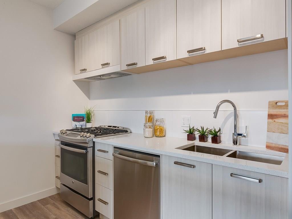 Modern Interiors: Units feature quartz countertops, stainless steel appliances, and expansive windows that provide ample natural light.