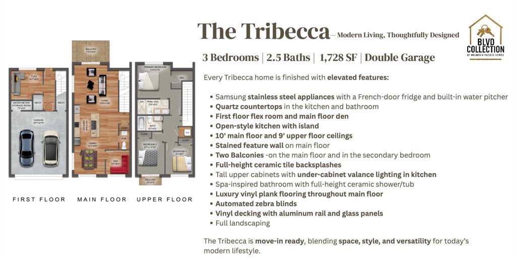 Discover modern living at its finest 3 Bedroom, 2.5 Bathroom Tribecca townhome, complete with a versatile flex room and a rare double-car garage. Thoughtfully designed for comfort, functionality, and elevated style, this home offers generous living spaces and refined finishes throughout.