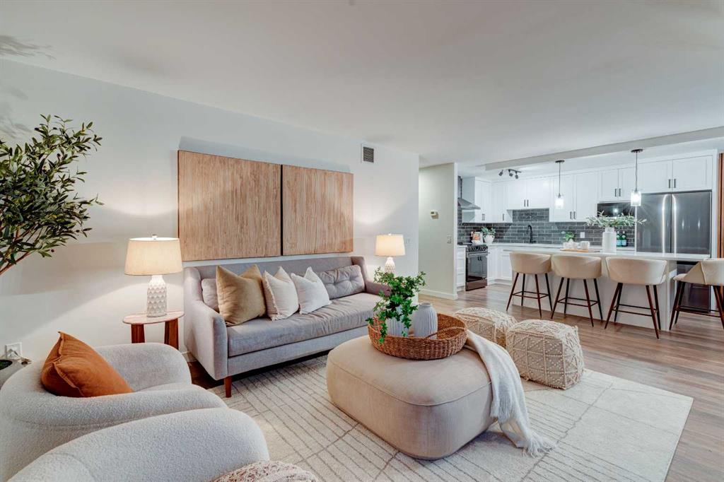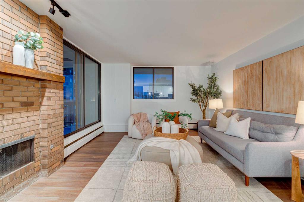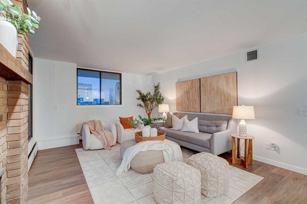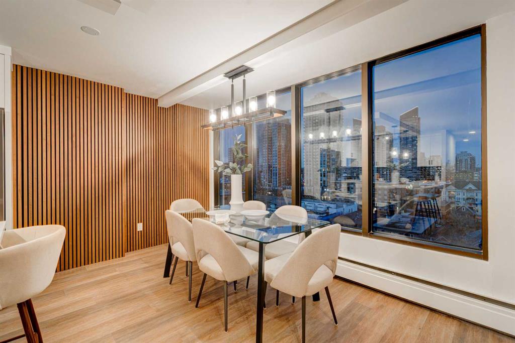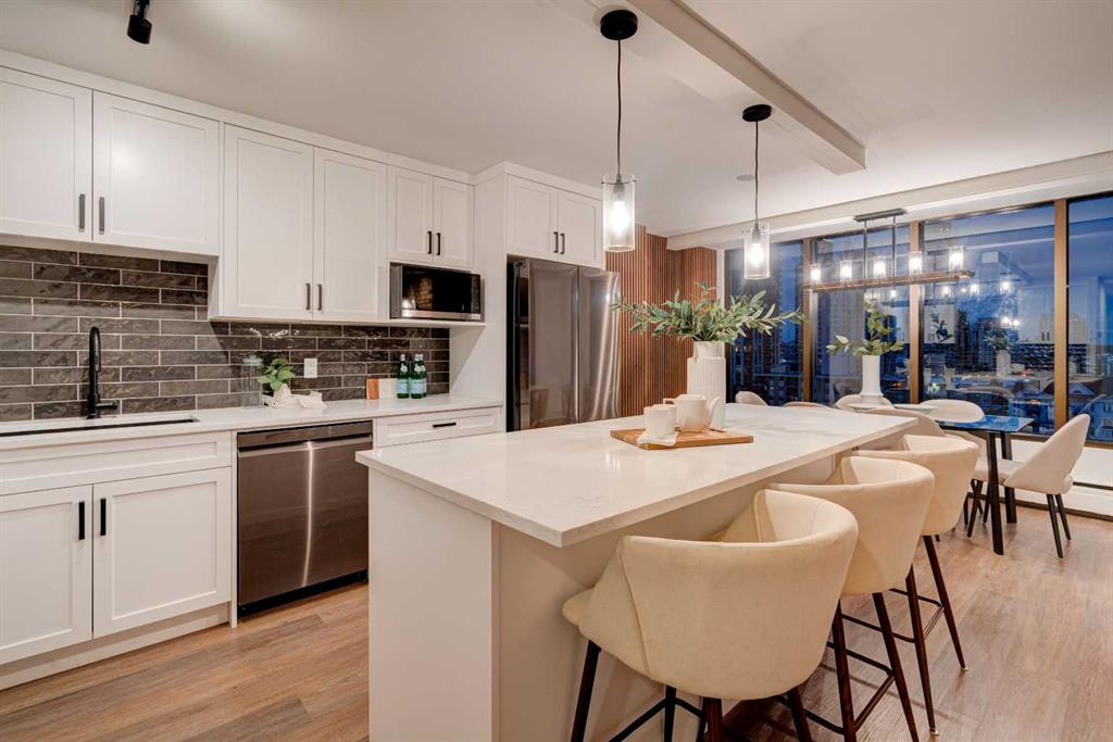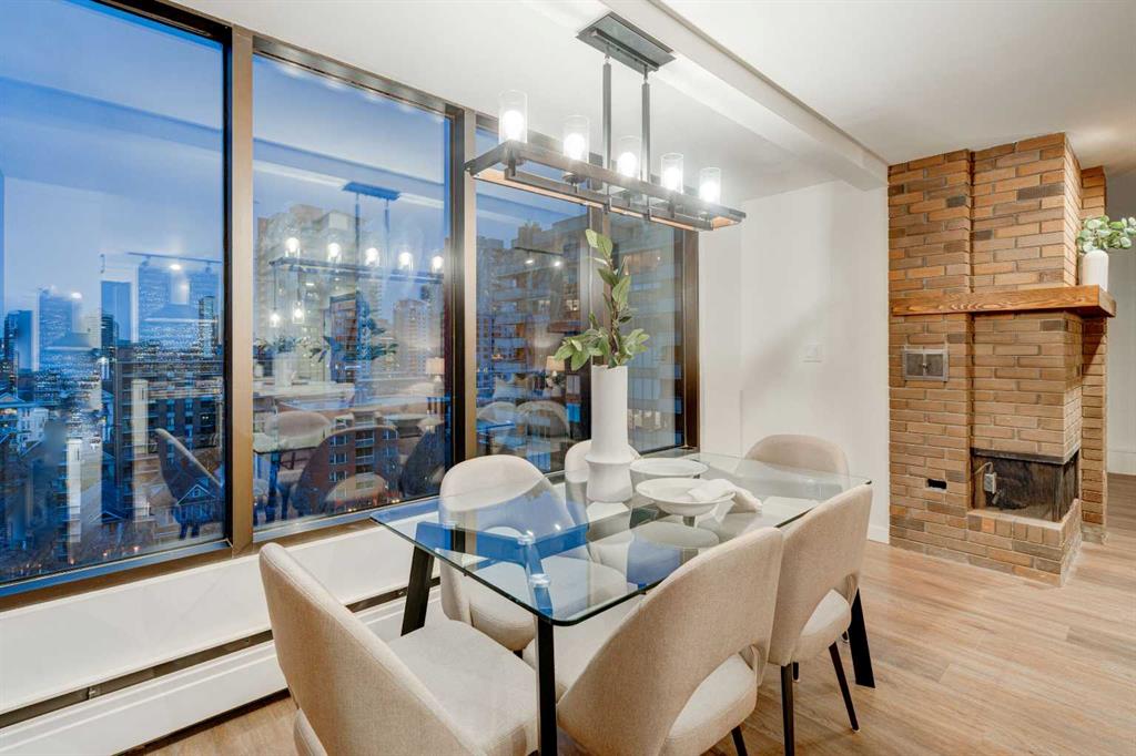 Welcome to Bristol Manor, an executive concrete building offering only 4 units per floor, ensuring a sense of exclusivity and privacy, located in the heart of Calgary's vibrant Beltline! This bright and spacious, fully renovated 2 bed, 2 bath condo offers 1123 sq ft of space and is located on the 10th floor with a wrap-around balcony providing stunning views of Calgary's downtown skyline. Upon entering you will notice a large front entry closet complete with custom wooden doors, and warm luxury vinyl plank floors that span the entire unit. Head down the hallway to the open concept main living area that is perfect for entertaining with the kitchen, dining, and living room flowing seamlessly together. The beautifully updated kitchen is tastefully done with full-height timeless white cabinets, matte black hardware, quartz countertops that include a large island with built-in wine rack, brand new black S/S appliance package, and a full pantry. Enjoy evening dinners or morning coffee while taking in the views through the floor-to-ceiling windows in the large dining room that comfortably seats 8, featuring an accent wall and chandelier. Relax in the cozy living room that is complete with an updated fireplace with an electric insert, or enjoy the scenery from your wrap-around balcony. Head to the expansive primary retreat, perfect for a king set, with a generous closet with custom wood doors and built-in shelving. The luxurious 3-piece ensuite boasts a walk-in tile shower, tiled floors, and a stylish floating vanity with ambient under-cabinet lighting and quartz countertops. Finishing out this stunning unit is a large second bedroom that can double as a home office, an updated 4-piece main bath, and a dream laundry room that includes a brand new washer and dryer, cabinet storage, and a quartz countertop making laundry a breeze! Other notable upgrades include fresh paint throughout, flat-painted ceilings, baseboards, and lighting. Bristol Manor has a rooftop patio with panoramic downtown views, an exercise room, sauna, games/social room, secure heated underground parking, and main-level bike storage. Experience the best of city living with high owner occupancy, an unbeatable walkability score, and just steps away from trendy shops and restaurants on 17th Ave. This condo truly offers the ultimate urban lifestyle! Book your showing today before it is gone!