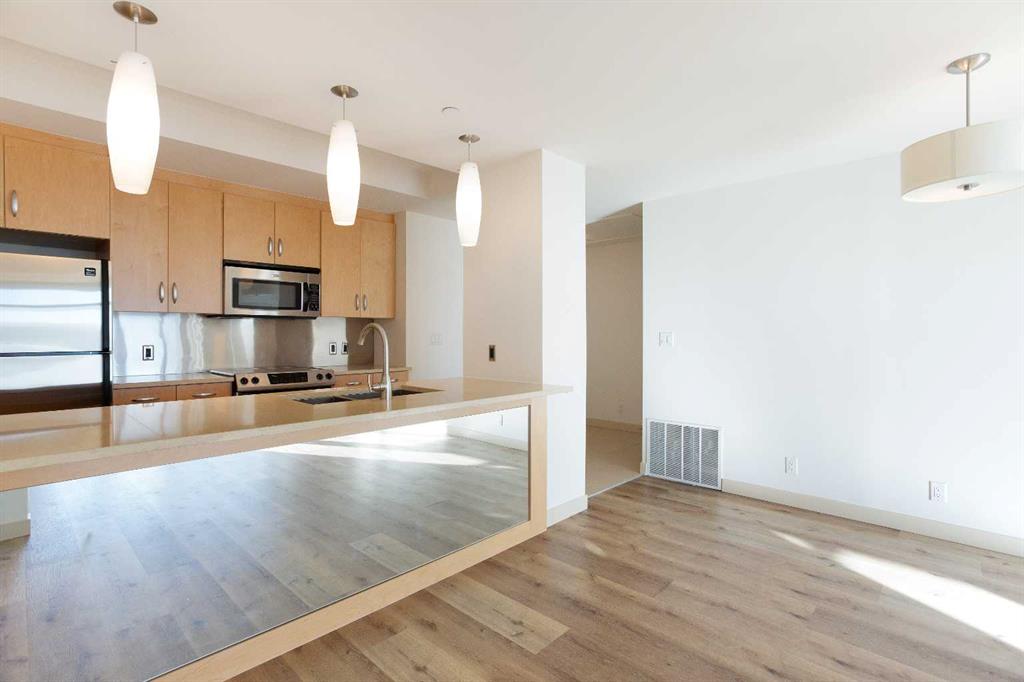 This stunning condo combines modern luxury with exceptional design, featuring brand-new flooring and fresh paint throughout. The open-concept floor plan showcases trendy wide plank flooring and a gorgeous kitchen equipped with quartz countertops, stainless steel appliances and a large breakfast bar perfect for entertaining. Floor-to-ceiling windows flood the space with natural light and offer unobstructed views. Step onto one of the largest and sunniest private balconies in the building to enjoy Calgary's vibrant skyline.