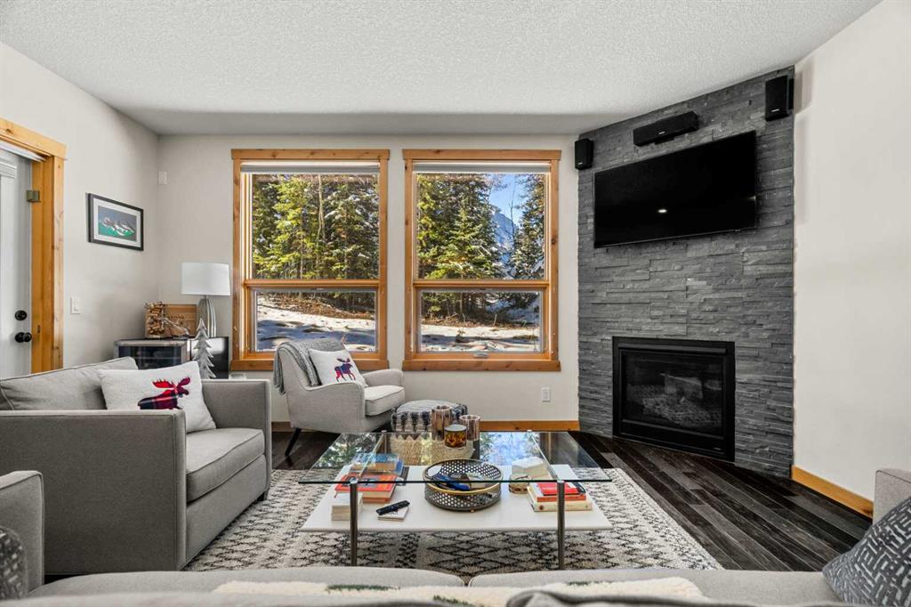 Located steps from the renowned Stewart Creek Golf Course and adjacent to the last stop on the Roam bus line, this property offers both tranquility and convenience. The highly anticipated Gateway at Three Sisters commercial development, set to bring a Sobeys grocery store along with shops and restaurants in the new year, is just a short walk away. Rounding out the offering is one assigned parking stall and a storage cage in the heated underground parkade. With its sunny, secluded setting and welcoming mountain aesthetic, this home perfectly captures the essence of Bow Valley living.