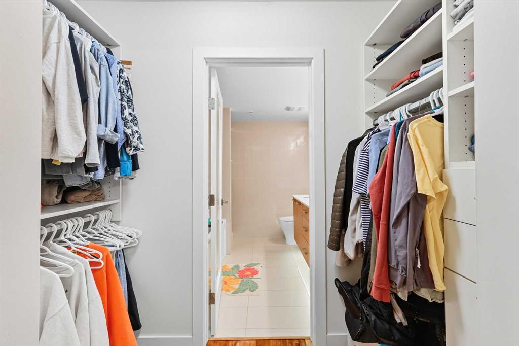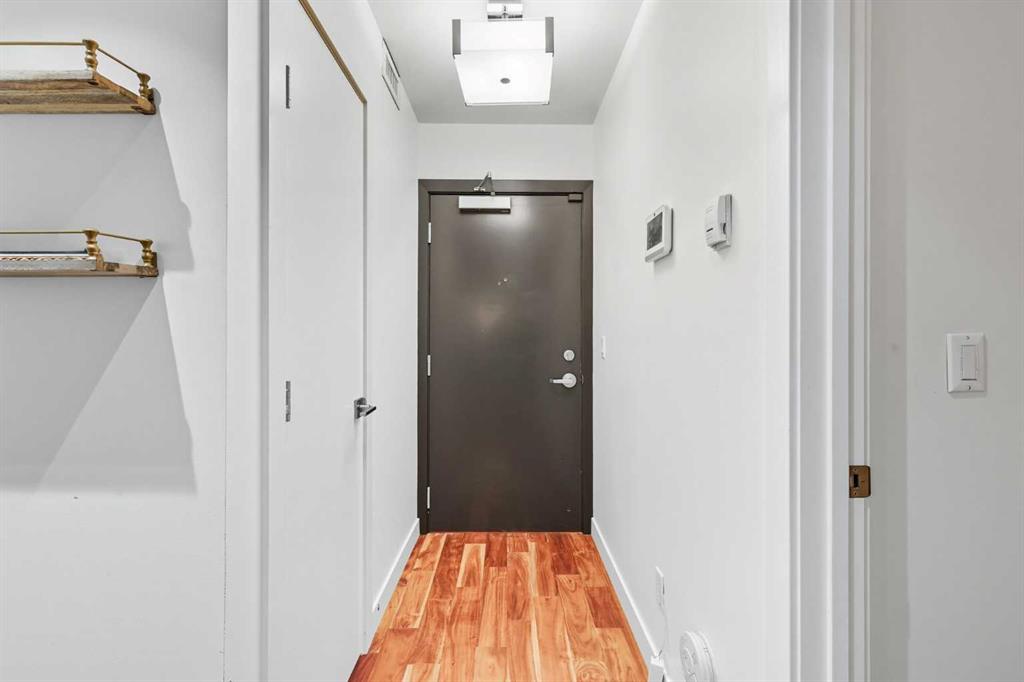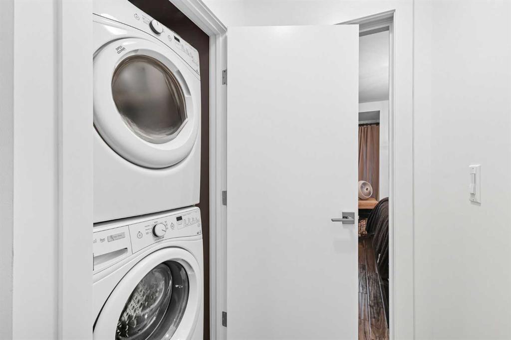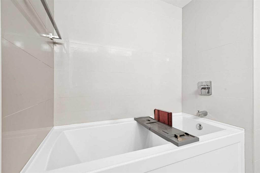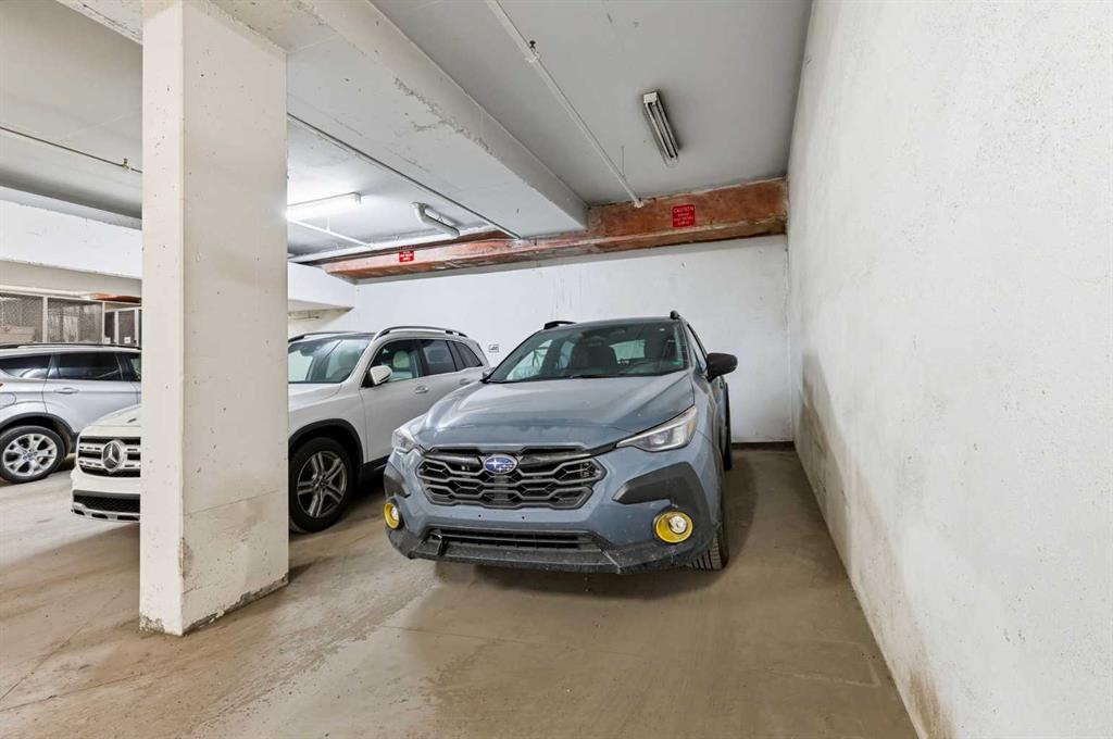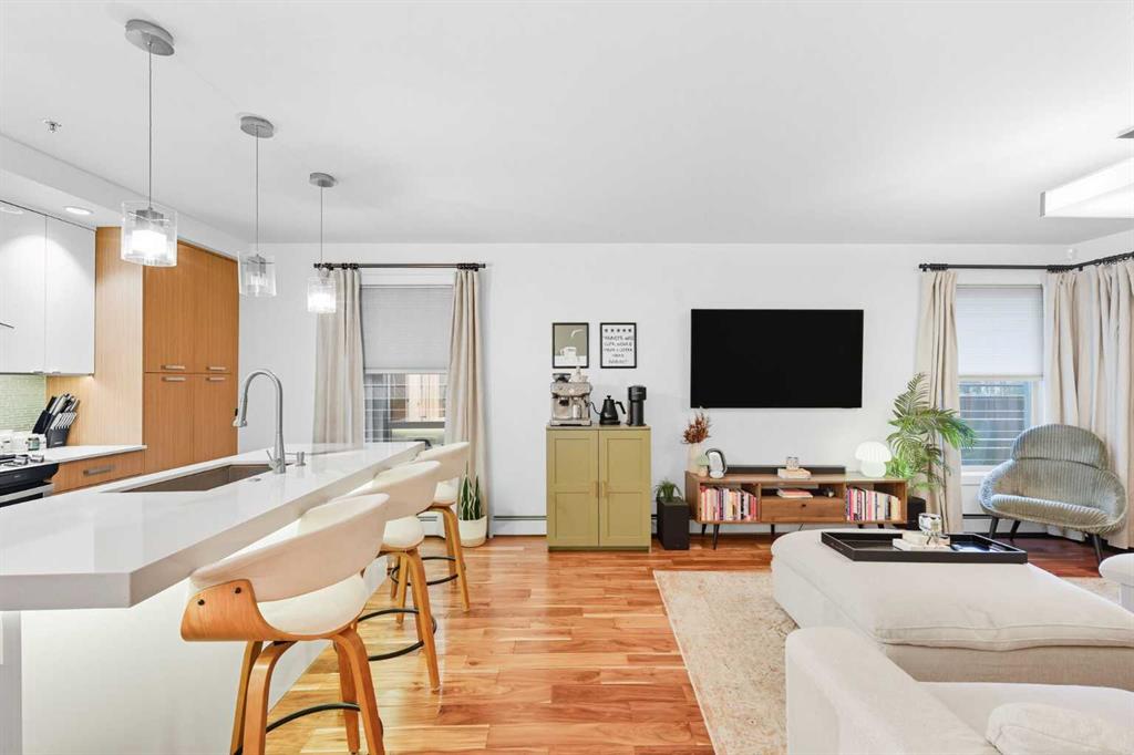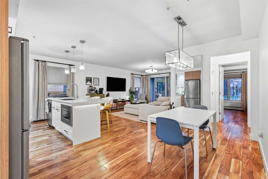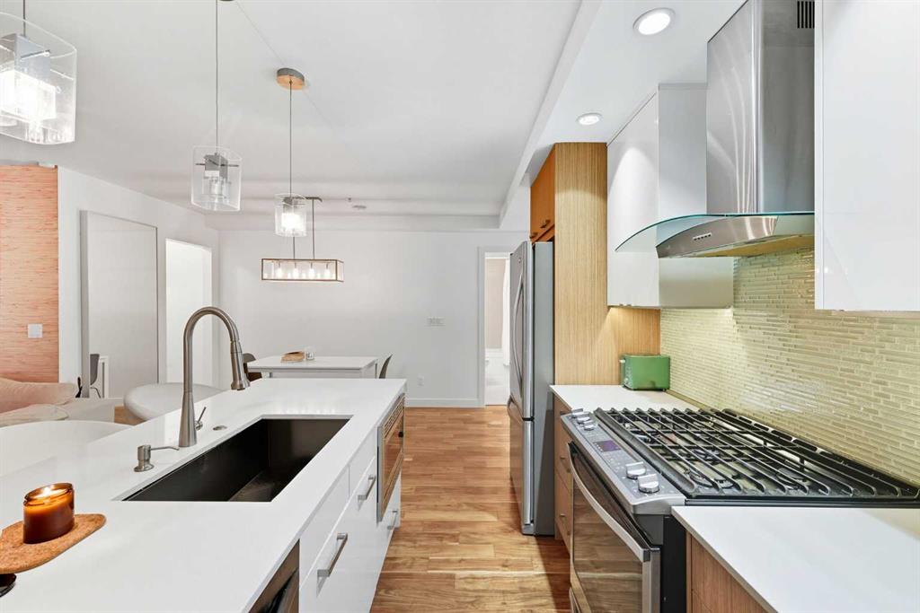 Welcome, and witness this sophisticated main floor 2-bedroom plus den corner residence, designed for those who appreciate both comfort and style. Experience upscale living blending modern elegance with unbeatable convenience. This home features features walnut hardwood floors, tinted windows, and a premium security system, and offers both style and peace of mind. The open-concept layout showcases a designer kitchen with custom two-tone cabinetry, full-height glass tile backsplash, a generous island with seating, and premium stainless steel appliances, including a gas range for the culinary enthusiast. The living space flows seamlessly into the living area, highlighted by a textured feature wall for added warmth and style. The primary suite impresses with a walk-through closet and spa-inspired ensuite with dual sink vanity, soaker tub, and glass shower. A second bedroom, full bath, and den complete the thoughtful floor plan. Enjoy in-suite laundry, private patio, titled underground parking, storage locker, and eco-friendly construction that lowers operating costs. You’re only steps away from a dog park, Bow River pathways, 17th Ave, shopping, transit and so much more