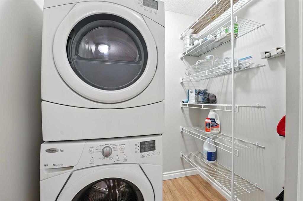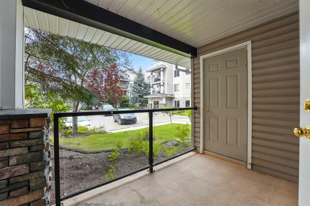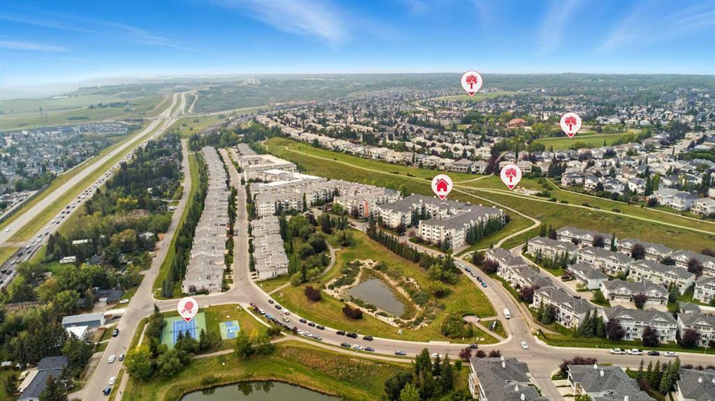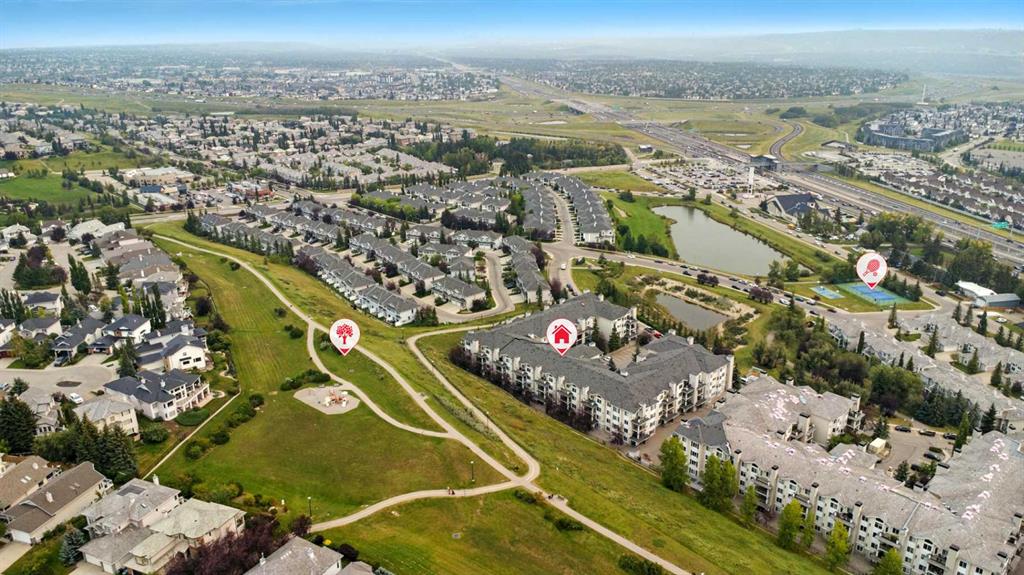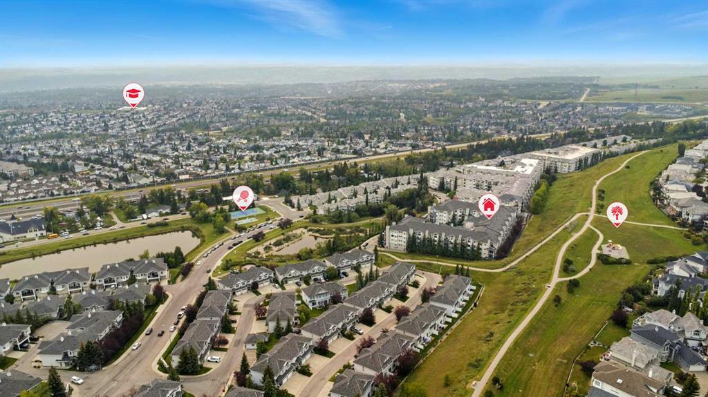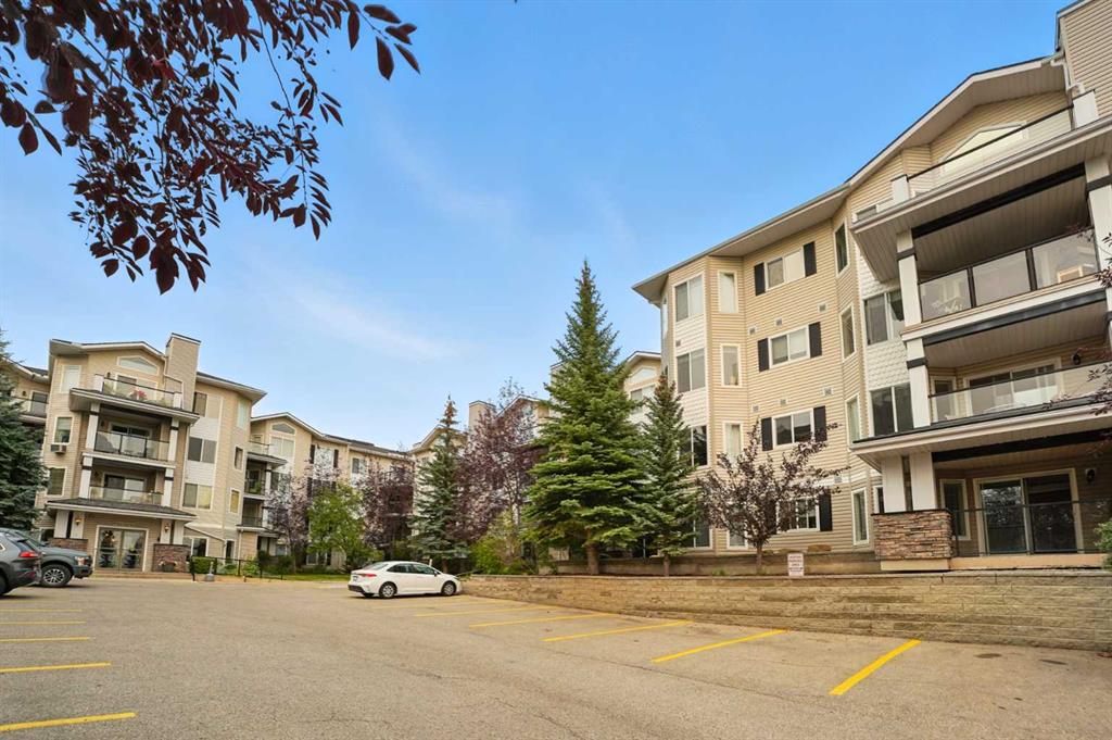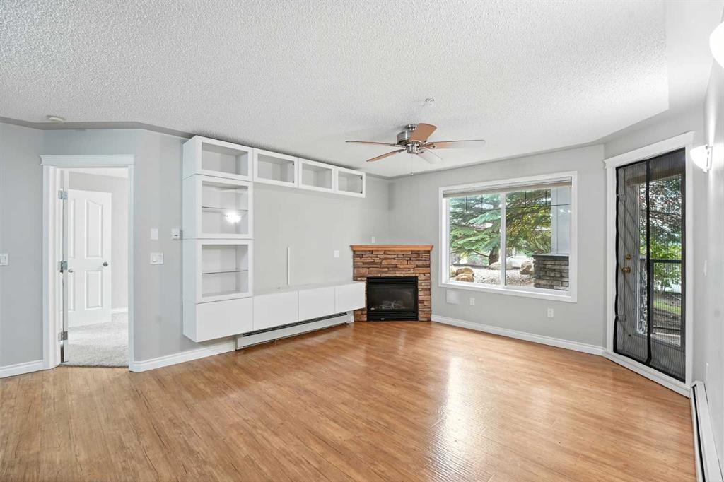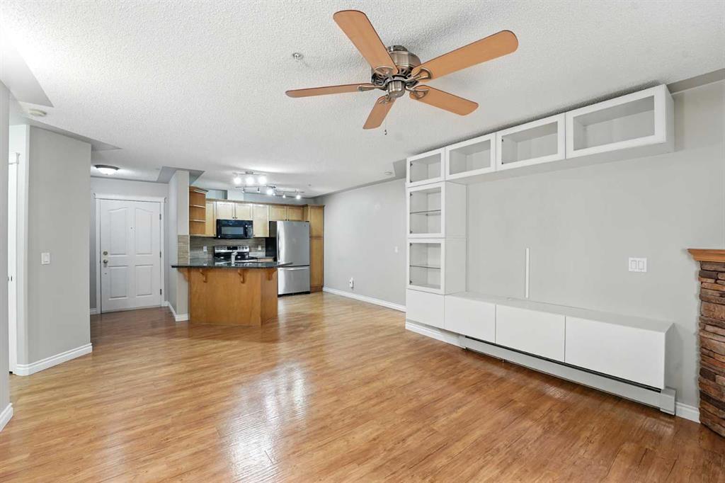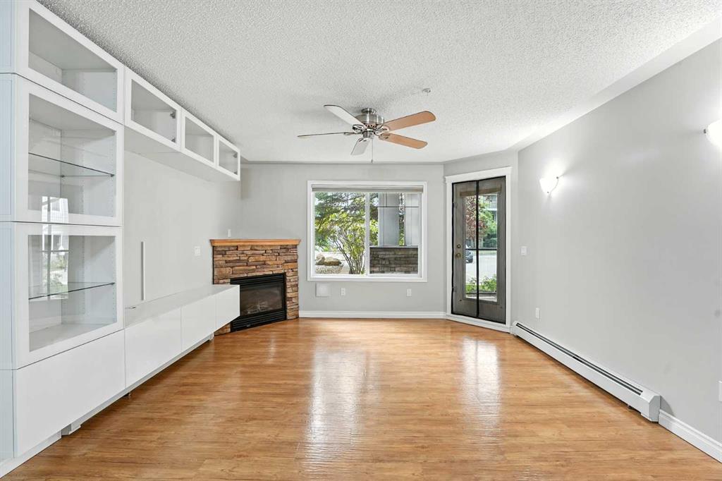 Welcome to the very desirable complex of The Pavilions at Rocky Ridge, where lifestyle meets convenience in this spacious and bright 2 bedroom, 2 bathroom ground-floor condo complete with underground parking and a private storage room located right on your own patio. Step inside through the welcoming front entry and into an open floor plan that showcases the generous kitchen, dining, and living areas. Large windows fill the unit with natural light while the beautiful laminate floors flow through the main living spaces, balanced by soft, plush carpet in the bedrooms. To the right of the entry, you’ll find a designated laundry room with a stacked washer and dryer that also offers extra storage. The kitchen features granite countertops, great cabinet space, and a seamless connection to the living and dining areas, making it ideal for entertaining or relaxing. The living room is highlighted by a cozy fireplace with a built-in media wall and direct access to your patio. The thoughtful split-bedroom layout gives maximum privacy, with the primary suite on one side featuring a walk-in closet that features custom built-ins, a private ensuite with granite countertops, and enough space to comfortably fit a king bed and all your furniture needs. On the opposite side of the unit is the spacious second bedroom, also large enough to accommodate full furnishings, located next to a 4-piece bathroom. This bright and spacious home is enhanced with thoughtful details like two-way top-down/bottom-up blinds, offering both privacy and maximum natural light. Step outside to your private patio, perfect for enjoying morning coffee or evening sunsets, with the convenience of a large storage room right on the deck. The Pavilions at Rocky Ridge also offers outstanding amenities including a theatre room, exercise facility, games room, meeting rooms, library, and even an on-site hair salon—all located within the building. Outside, you’ll love being surrounded by green space with a pond, walking paths, seating areas, and sports courts right out front. Rocky Ridge itself is one of Northwest Calgary’s most desirable communities, known for its natural setting, mountain views, family-friendly atmosphere, and unbeatable access to shopping, the LRT station, and major roadways. This is a rare opportunity to own a bright and spacious home in an incredible location—you will be impressed!