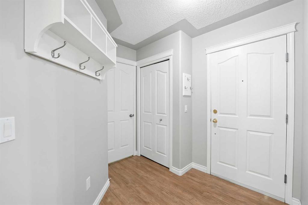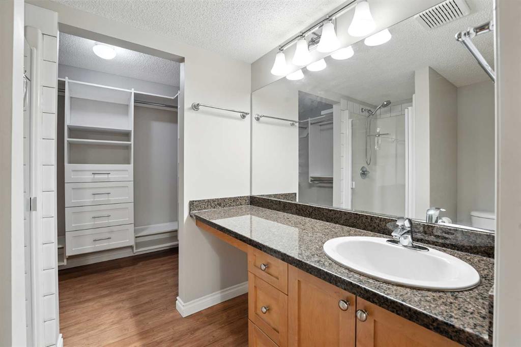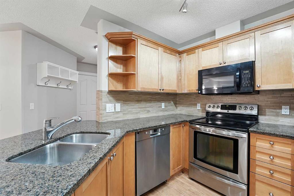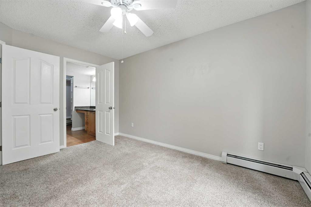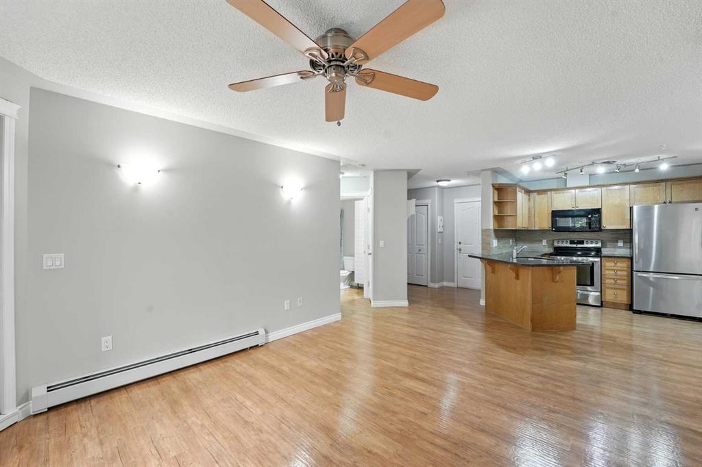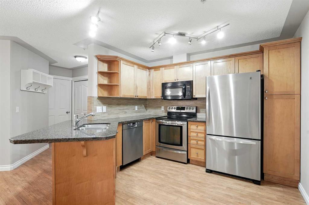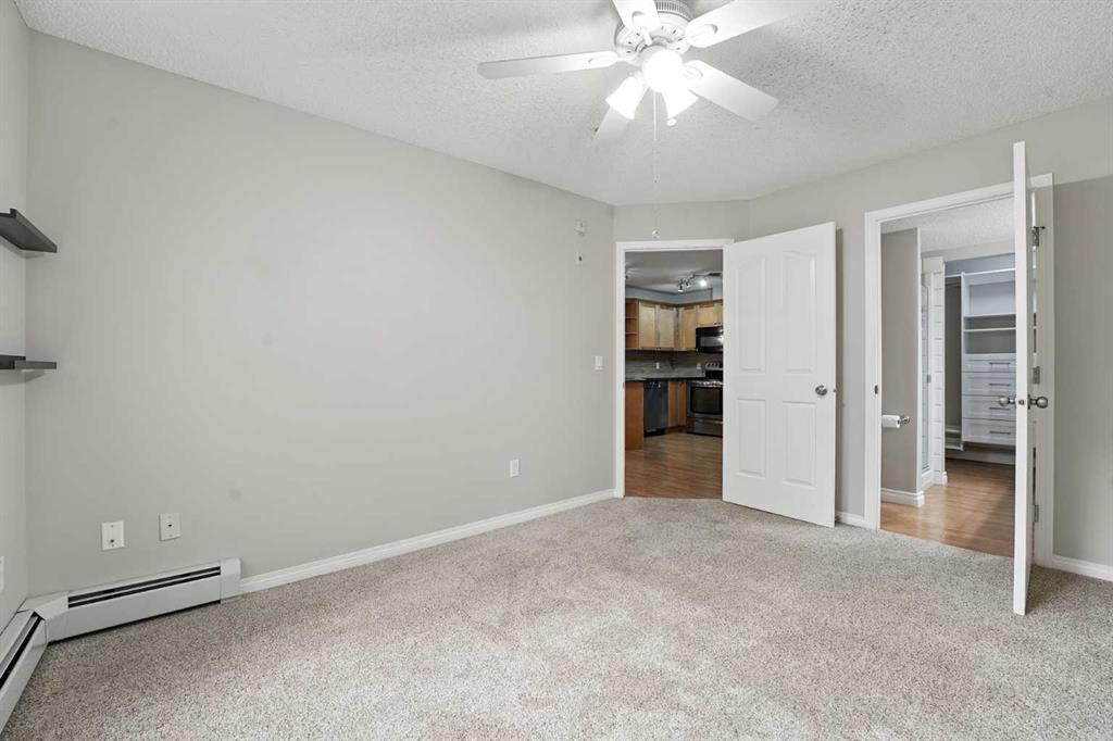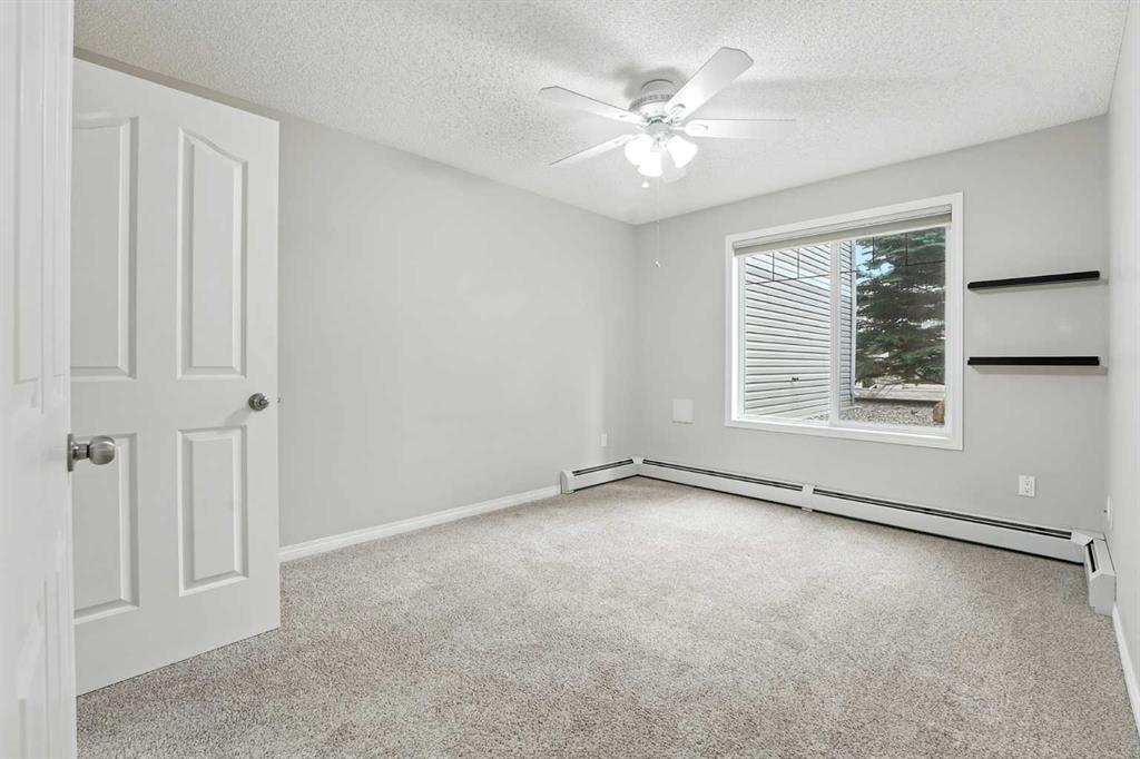Welcome to the very desirable complex of The Pavilions at Rocky Ridge, where lifestyle meets convenience in this spacious and bright 2 bedroom, 2 bathroom ground-floor condo complete with underground parking and a private storage room located right on your own patio. Step inside through the welcoming front entry and into an open floor plan that showcases the generous kitchen, dining, and living areas. Large windows fill the unit with natural light while the beautiful laminate floors flow through the main living spaces, balanced by soft, plush carpet in the bedrooms. To the right of the entry, you’ll find a designated laundry room with a stacked washer and dryer that also offers extra storage. The kitchen features granite countertops, great cabinet space, and a seamless connection to the living and dining areas, making it ideal for entertaining or relaxing. The living room is highlighted by a cozy fireplace with a built-in media wall and direct access to your patio. The thoughtful split-bedroom layout gives maximum privacy, with the primary suite on one side featuring a walk-in closet that features custom built-ins, a private ensuite with granite countertops, and enough space to comfortably fit a king bed and all your furniture needs. On the opposite side of the unit is the spacious second bedroom, also large enough to accommodate full furnishings, located next to a 4-piece bathroom. This bright and spacious home is enhanced with thoughtful details like two-way top-down/bottom-up blinds, offering both privacy and maximum natural light. Step outside to your private patio, perfect for enjoying morning coffee or evening sunsets, with the convenience of a large storage room right on the deck. The Pavilions at Rocky Ridge also offers outstanding amenities including a theatre room, exercise facility, games room, meeting rooms, library, and even an on-site hair salon—all located within the building. Outside, you’ll love being surrounded by green space with a pond, walking paths, seating areas, and sports courts right out front. Rocky Ridge itself is one of Northwest Calgary’s most desirable communities, known for its natural setting, mountain views, family-friendly atmosphere, and unbeatable access to shopping, the LRT station, and major roadways. This is a rare opportunity to own a bright and spacious home in an incredible location—you will be impressed!