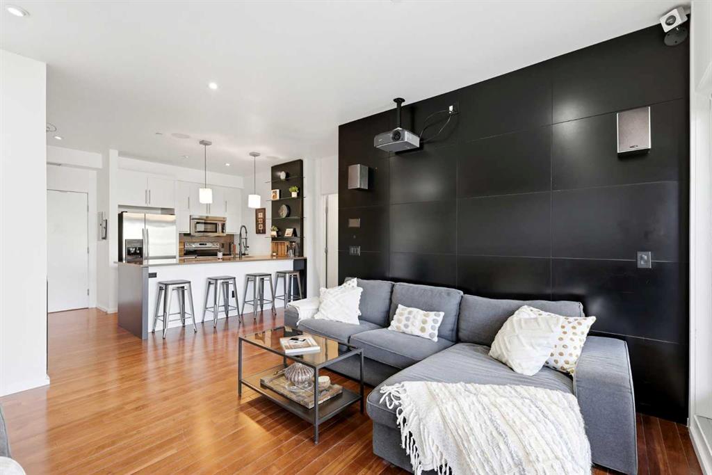 LOW CONDO FEES ($390) | UNDERGROUND PARKING | WALK-OUT PATIO w GREENSPACE | HOME AUTOMATION SYSTEM | PRIME INNER-CITY LOCATION | PET FRIENDLY | AFFORDABLE AND FUNCTIONAL INNER CITY LIVING DOESN'T GET BETTER THAN THIS! Steps to the river and an easy walk to downtown, you’re close to the core without being right downtown —offering the best of both worlds. You'll love the WALK-OUT PATIO BACKING ONTO PRIVATE GREENSPACE, complete with a BBQ GAS LINE and space for outdoor storage — this home is the ideal setup for pet owners. Featuring 550 sq ft of well-designed living space: HARDWOOD FLOORING, QUARTZ COUNTERTOPS, STAINLESS STEEL APPLIANCES, BREAKFAST BAR SEATING, AND 9 FOOT CEILINGS. The main living area is enhanced by by both GLASS AND CUSTOM WOOD-PANELED FEATURE WALLS, a 92” MOTORIZED PROJECTION SCREEN, AND SURROUND SOUND SPEAKERS. Your smart home comes fully equipped with a CONTROL4 HOME AUTOMATION SYSTEM, allowing seamless control of lighting, temperature, locks, audio, and more. Your IN-SUITE LAUNDRY checks that box as well. This unit is stacked with FEATURES RARELY FOUND IN CONDO LIVING, offering exceptional value and LOW CONDO FEES.