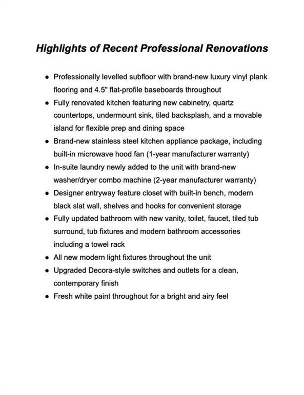 Be the first to enjoy this completely renovated Beltline condo, offering the feel of a brand new home at the price point of an older unit. Every finish in the home has been thoughtfully updated to create a cohesive, modern living space. The bright open-concept layout features a stunning two-tone kitchen with brand new cabinetry, quartz countertops, a contemporary tile backsplash, and brand new stainless steel appliances including a microwave hood fan, all under warranty for added peace of mind. A functional island provides additional prep and seating space and can easily be repositioned within the kitchen depending on your preferred layout. New luxury vinyl plank flooring runs throughout the home, complemented by fresh paint, updated lighting, modern fixtures, and new 4.5-inch baseboards for a clean, elevated finish. The home also features brand new in-suite laundry with a washer and dryer combo, also under warranty. One of the standout features of this unit is the extra-long private balcony measuring over 24 feet, with sliding glass doors from both the living room and the bedroom, creating a seamless connection between indoor and outdoor living. From the unit you can conveniently see your assigned parking stall and enjoy quick access to the parkade. Located on the ground floor, this home offers the convenience of avoiding elevators while still maintaining excellent privacy and security, as the private patio is positioned above the parkade level with no direct exterior access to the unit. The home is situated in a clean, well-managed concrete building with no post-tension cables and features an inviting lobby, elevator access, and bike storage. Vinyl windows throughout the building were replaced approximately two years ago. The property includes an assigned parking stall and dedicated storage unit, and parking stalls in the building have historically rented for approximately $100 per month, creating additional flexibility for owners. Additional street parking is available nearby for guests or a second vehicle. With reasonable condo fees and excellent rental potential, this property is an ideal opportunity for first-time buyers, young professionals, downsizers, or investors seeking a turnkey unit in a prime inner-city location, just steps from shops, restaurants, transit, and everyday amenities. Vacant and available for quick possession.