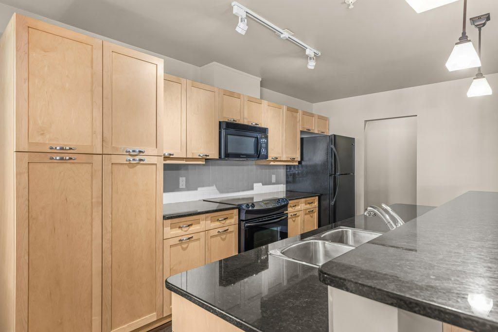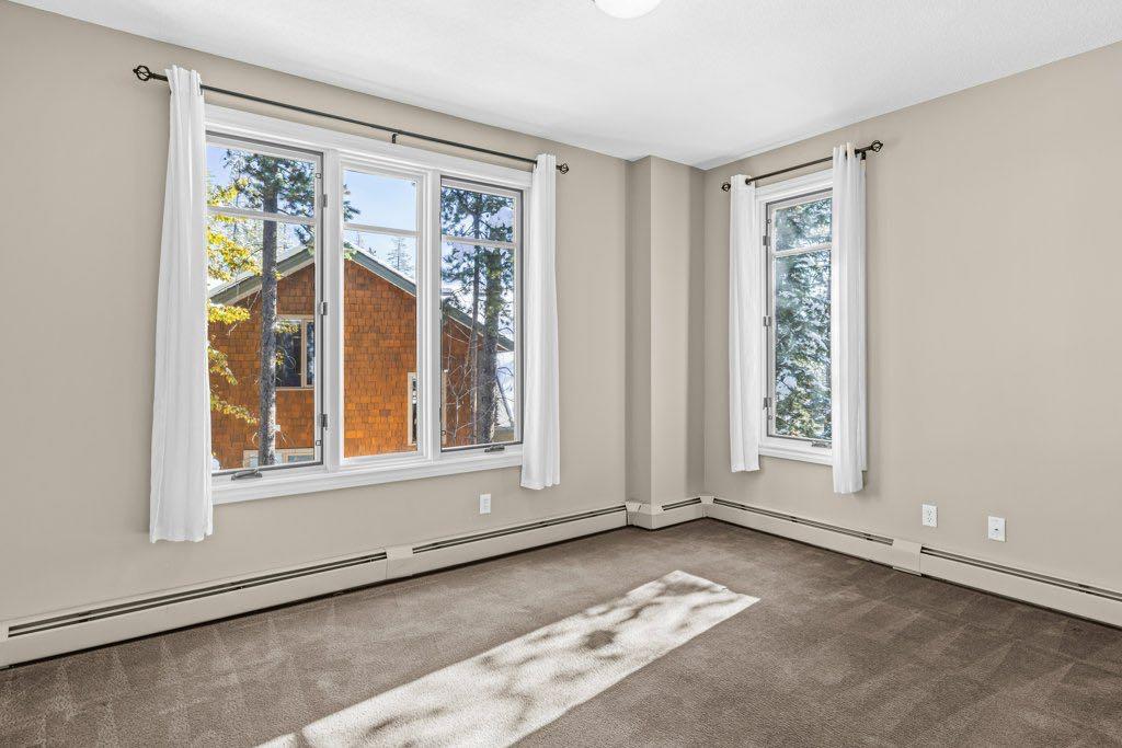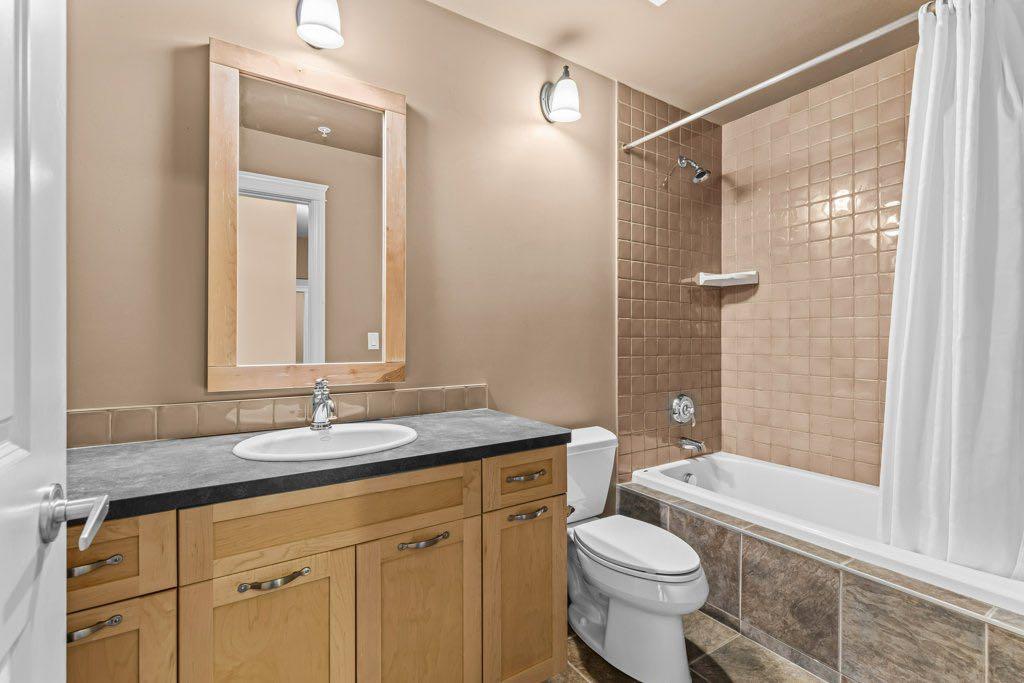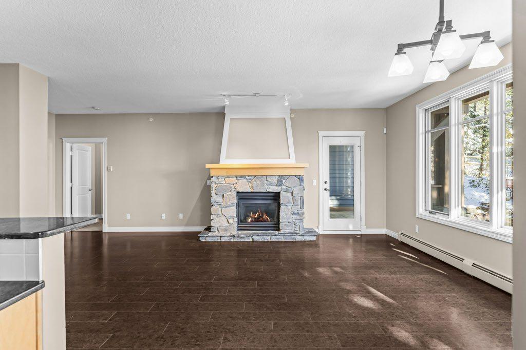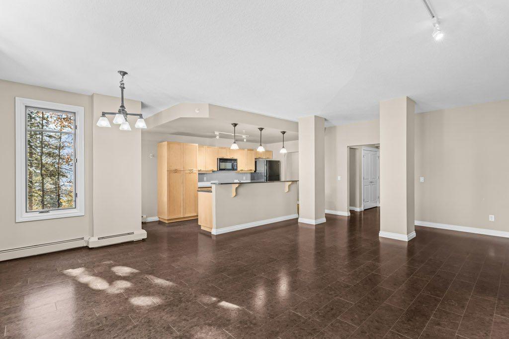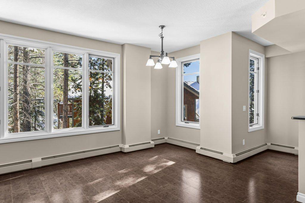 Welcome to your perfect mountain retreat! This spacious 2-bed + den condo offers bright, open-concept, one-level living with south-east exposure and abundant natural light. Enjoy cozy evenings by the natural stone gas FP, or sip your morning coffee on the large east-facing deck while taking in tranquil forest and mountain views. The spacious primary suite is a true sanctuary, featuring a luxurious 5-piece ensuite with dual vanities, a soaker tub, and a separate shower. Your guests will appreciate the privacy of the second bed, located on the opposite side of the unit, with a 4-piece bath nearby. The den is ideal for a home office or additional sleeping area. Additional features include in-suite storage, 2 titled parking stalls, and extra storage in the underground parkade—perfect for all your mountain gear. Built with concrete construction and 9-foot ceilings, this quiet condo combines comfort, quality, and stunning natural surroundings.
