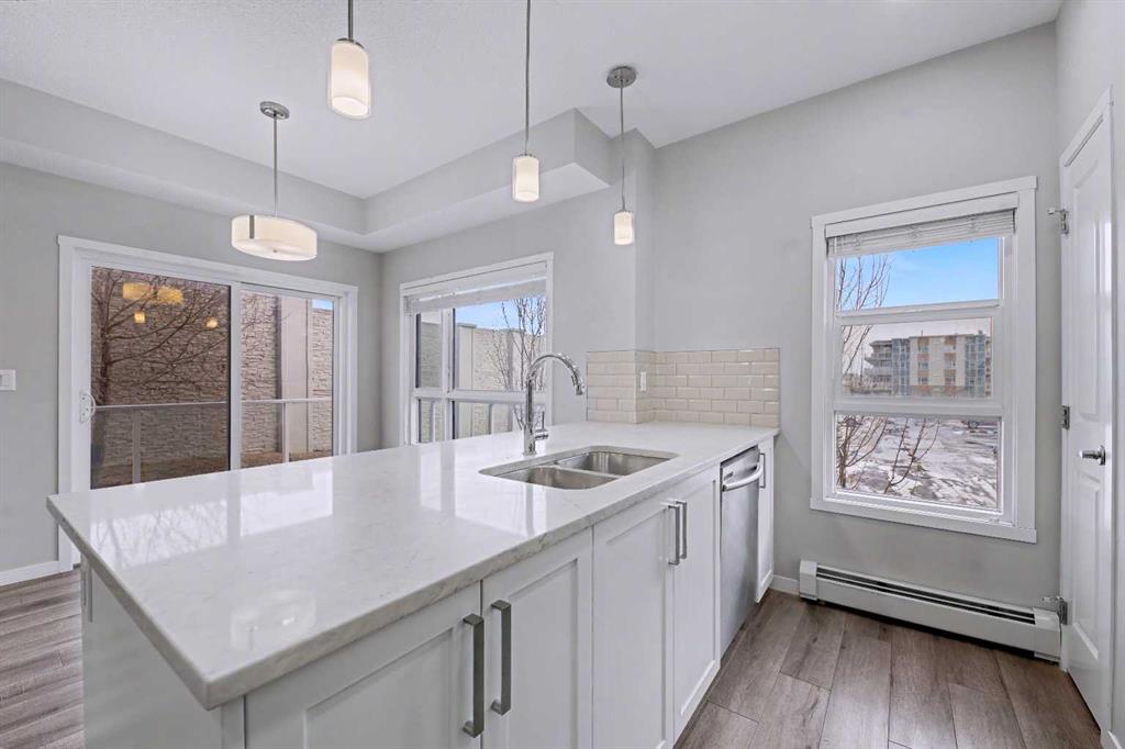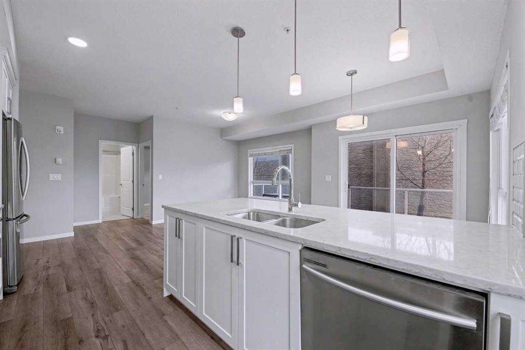 Welcome to Harvest Hills, a well-established community in NE Calgary offering an ideal blend of convenience and lifestyle, featuring Harvest Hills Lake, The Golf Centre at Harvest Hills, Harvest Hills Parks, and the Harvest Hills Community Garden, with nearby amenities including Landmark Cinemas, Canadian Tire, The Home Depot, Sobeys, and additional shopping and dining options just north of the community, while within the neighborhood to the east you’ll find Starbucks, Kinjo Sushi, and other local shops, along with excellent school options such as Ascension of Our Lord School, Northern Lights School, and Notre Dame High School; this spacious 2-bedroom, 2-bathroom condo offers a thoughtfully designed layout with luxury finishes throughout, a primary bedroom that comfortably fits a king-size bed with side tables, a primary ensuite featuring a double vanity and walk-in closet, a modern kitchen with upgraded quartz countertops and high-end finishes, and bright open living spaces, with the standout feature being the expansive wrap-around balcony that provides generous outdoor living space, ample sunlight, and endless possibilities for relaxation or entertaining—an exceptional opportunity for those looking to secure their next home in a prime Calgary location.