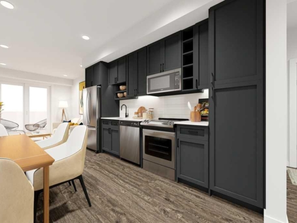 Step into a beautifully designed kitchen featuring rich cabinetry, white quartz countertops, stainless steel appliances, and durable luxury vinyl plank flooring that flows throughout the main level. The open layout connects seamlessly to the dining and living areas — an inviting space for both entertaining and everyday comfort.