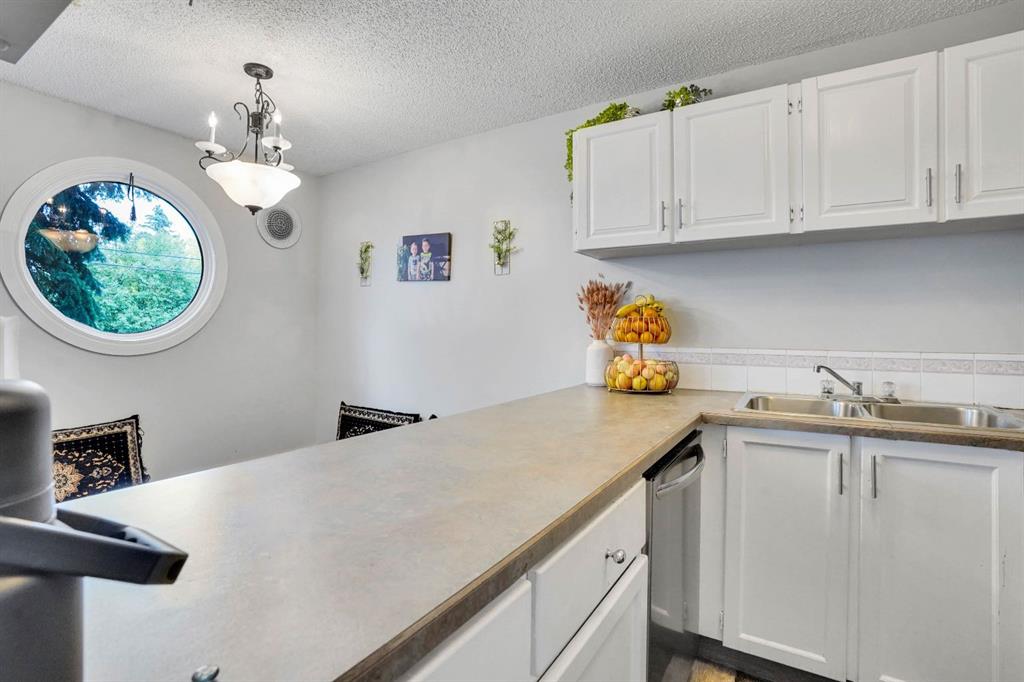 The U-shaped kitchen is designed for function with stainless steel appliances, ample cabinet space, and a versatile island for casual dining or extra prep. A bright and welcoming living room features large windows and access to a private north-facing balcony (balconies and railings updated in 2023), perfect for relaxing. The adjacent dining area (or home office) is highlighted by a charming circular accent window that adds character to the space.