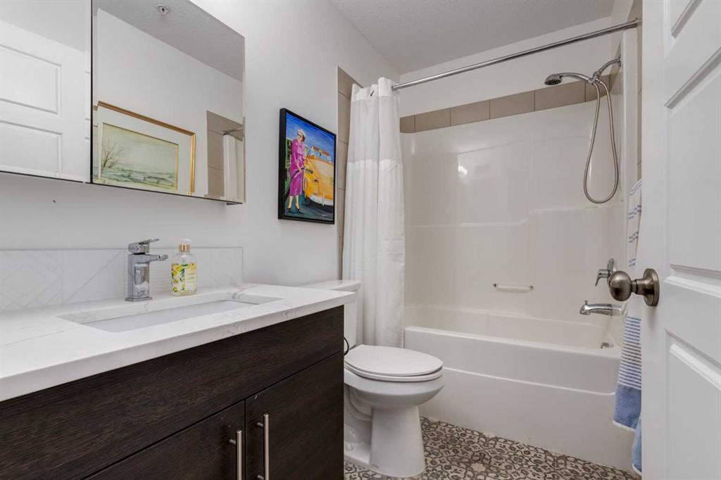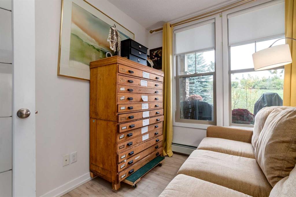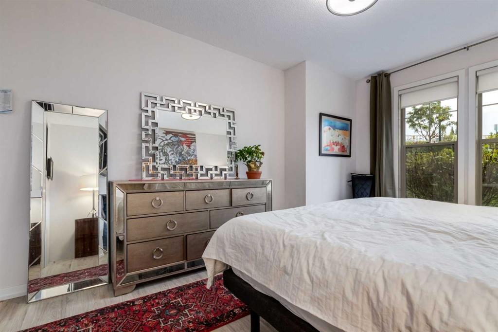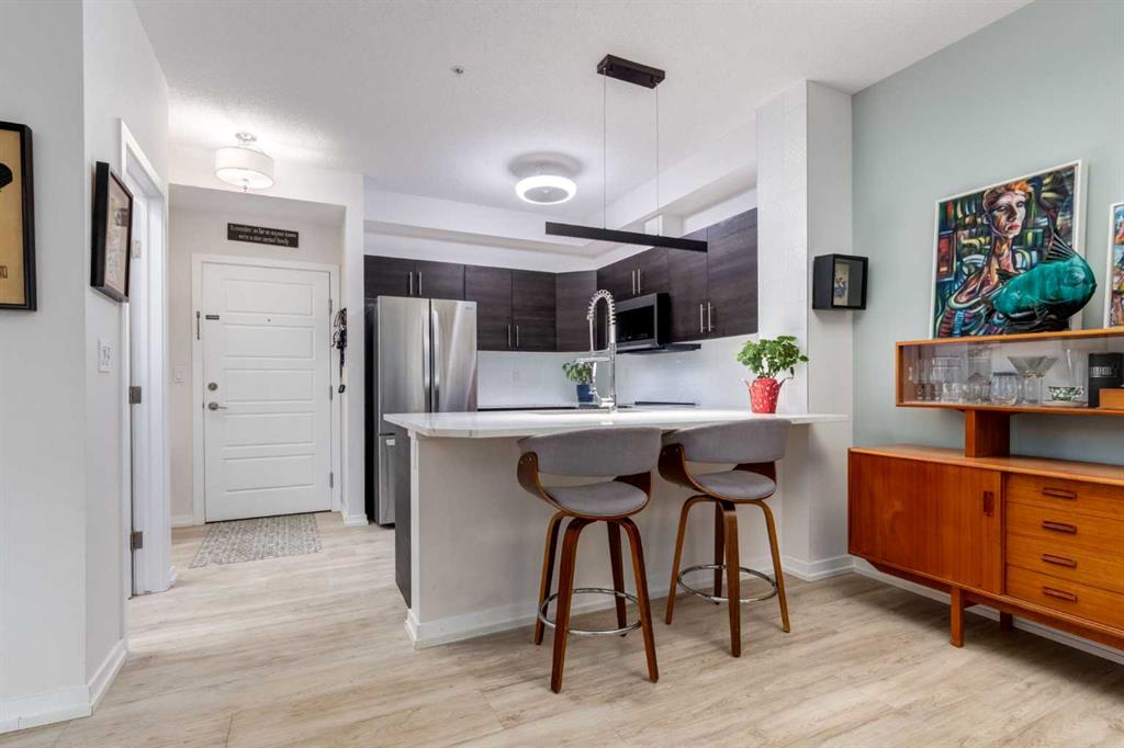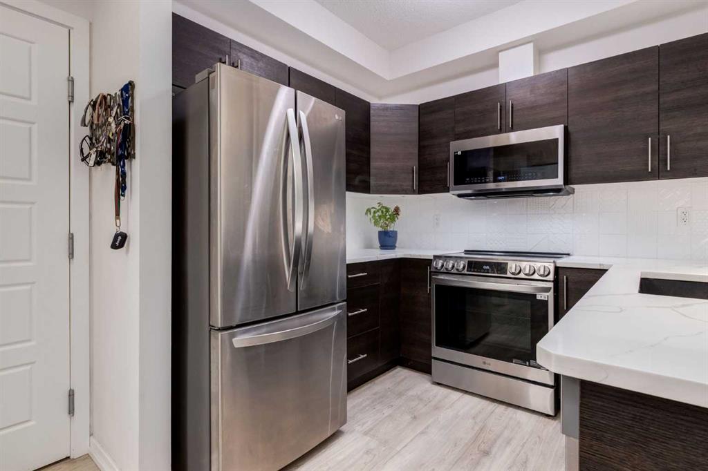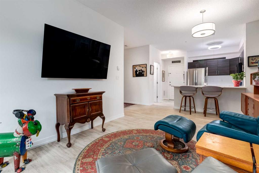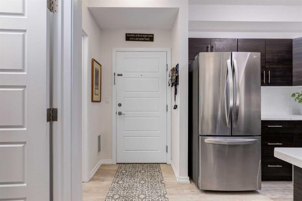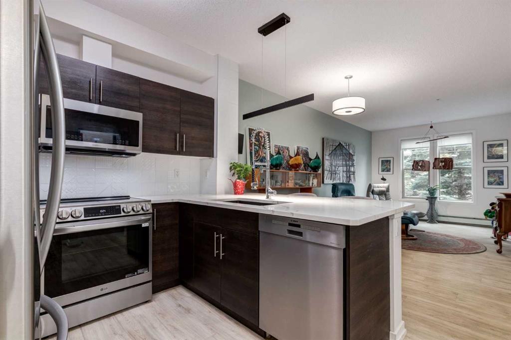 This meticulously cared-for apartment-style condo blends style and function with a bright, neutral palette and thoughtful luxury upgrades throughout. The spacious primary suite offers a walk-through closet and generous ensuite, while a French-door den provides the perfect work-from-home space or spare bedroom. Recent renovations include luxury vinyl plank flooring throughout, new stainless steel kitchen appliances, quartz countertops with a modern backsplash and faucet, updated vanities with new sinks and faucets, and professionally installed window coverings. Both bathrooms and utility areas feature upgraded flooring, and high-profile toilets add to the quality finishes. The well-appointed kitchen boasts abundant cupboard space, a sizable pantry, and a separate enclosed laundry room with additional storage. Enjoy your morning coffee on your uniquely private ground level patio while taking in breathtaking Cochrane sunrises. Living at Alora in Sunset Ridge means access to a fully equipped fitness centre just down the hall and guest suites for visitors. A titled, heated underground parking stall with storage locker is also included. Move-in ready and beautifully updated, this condo is priced to sell—don’t miss out!