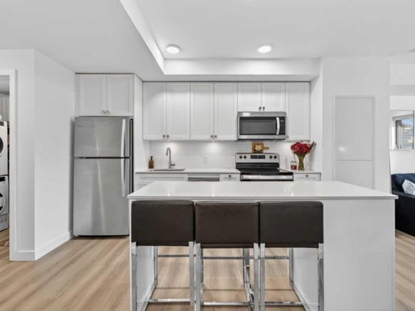 The kitchen is equipped with NEWER stainless steel appliances, and the east-facing balcony—with glass railing, on-deck storage shed, and a gas line for your BBQ—provides the perfect outdoor extension of your living space.