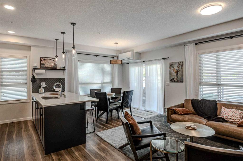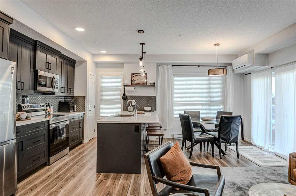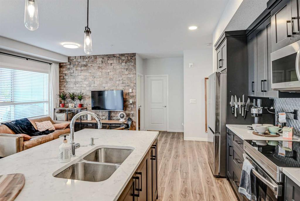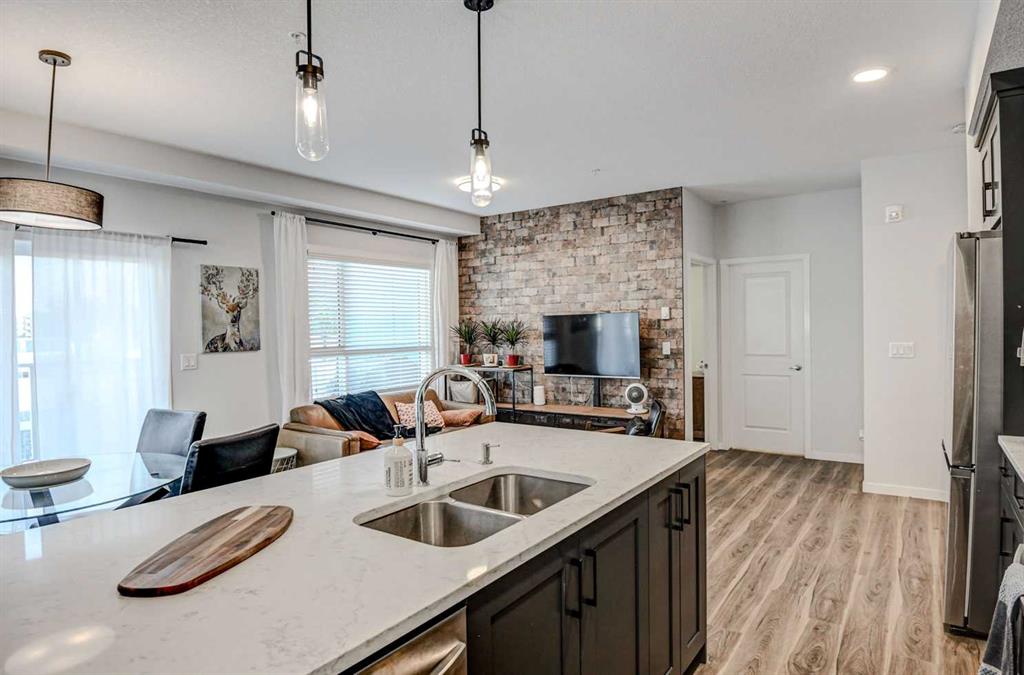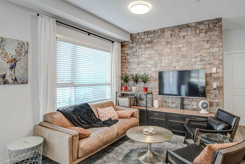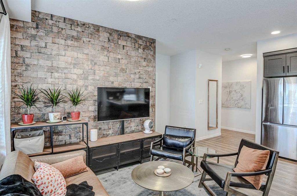 Prepare to be captivated by this stunning end unit, corner ground floor with 2-bed and 2-bath in Seton. Former show suite by Cedarglen Homes, boast high end finishes , modern layout and upgrades. The open & spacious living room includes a chic Chicago brick feature wall and a large low E triple glazed window. Open concept layout that seamlessly combine style and functionality. Comfort is ensured with zoned electric baseboard heating and a Fresh Air System (ERV) . The luxury vinyl plank flooring is all the way through for fast & easy cleaning. No carpet here. The primary suite is spacious with a double vanity ensuite and a walk-in closet. The other good sized bedroom provides access to a full 4-pc bathroom. Step through the kitchen which boast quartz countertops, stainless steel appliances and ample storage within the ceiling-height melamine cabinets. This stylish unit also comes in with an ensuite laundry, titled underground parking and a huge private concrete patio with a gas line for your BBQ. It is also a pet friendly complex (Board approval) up to 40 kilograms. A low- maintenance living- allowing you more free time to enjoy what you love. Perfect for Seniors, Professionals, Young couples, Students, First time home owner or to investors.. This complex is just a walking distance to South Campos Hospital, YMCA, school, shops, restaurant and other amenities.. It is also an easy access to Stoney Trail and Deerfoot Trail.... Please note that the seller is willing to negotiate on any of the contents in the unit.