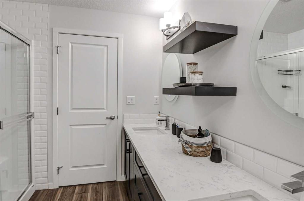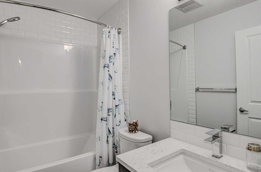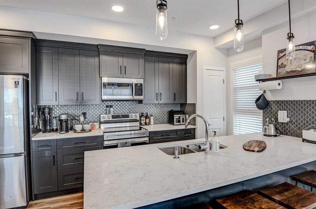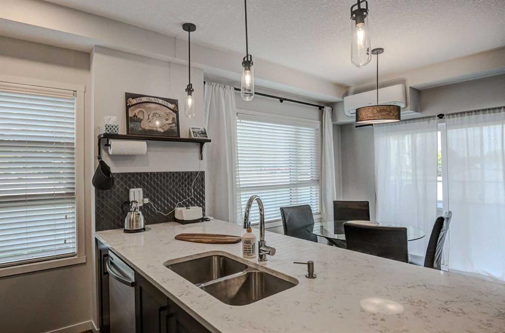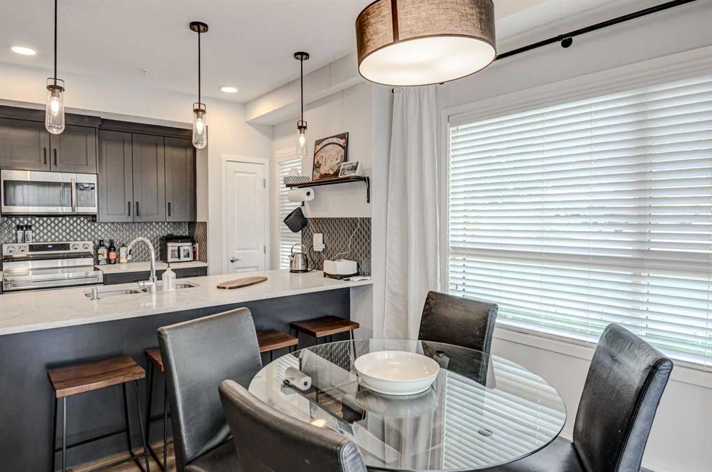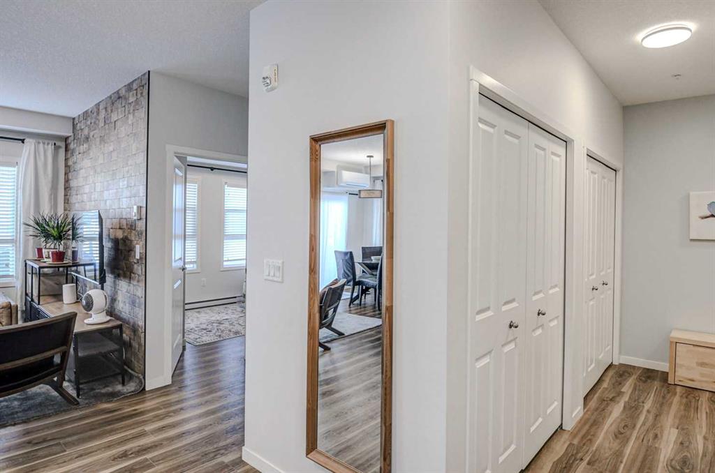 Prepare to be captivated by this stunning end unit, corner ground floor with 2-bed and 2-bath in Seton. Former show suite by Cedarglen Homes, boast high end finishes , modern layout and upgrades. The open & spacious living room includes a chic Chicago brick feature wall and a large low E triple glazed window. Open concept layout that seamlessly combine style and functionality. Comfort is ensured with zoned electric baseboard heating and a Fresh Air System (ERV) . The luxury vinyl plank flooring is all the way through for fast & easy cleaning. No carpet here. The primary suite is spacious with a double vanity ensuite and a walk-in closet. The other good sized bedroom provides access to a full 4-pc bathroom. Step through the kitchen which boast quartz countertops, stainless steel appliances and ample storage within the ceiling-height melamine cabinets. This stylish unit also comes in with an ensuite laundry, titled underground parking and a huge private concrete patio with a gas line for your BBQ. It is also a pet friendly complex (Board approval) up to 40 kilograms. A low- maintenance living- allowing you more free time to enjoy what you love. Perfect for Seniors, Professionals, Young couples, Students, First time home owner or to investors.. This complex is just a walking distance to South Campos Hospital, YMCA, school, shops, restaurant and other amenities.. It is also an easy access to Stoney Trail and Deerfoot Trail.... Please note that the seller is willing to negotiate on any of the contents in the unit.