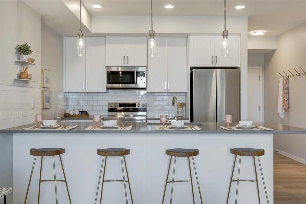 INTRODUCING ALPINE PARK PLACE, IN BEAUTIFUL SOUTHWEST CALGARY. BUILT BY CEDARGLEN LIVING, WINNER OF THE Customer Insight BUILDER OF CHOICE AWARD, 6 YEARS RUNNING! BRAND NEW "A" unit with high-spec features. You will feel right at home in this well thought-out, 514. RMS sq.ft. (565 sq.ft. builder size). 1 bed, 1 bath home with open plan, 9' ceilings, LVP flooring throughout common areas, carpets in the bedrooms and closets, Low E triple glazed windows, BBQ gas line on the patio, Fresh Air System (ERV), and so much more. The kitchen is spectacular with full height cabinets, quartz counters, undermount sink, rough-in water line to the fridge and S/S appliances. The island is extensive with built in flush breakfast bar, which transitions into the spacious living area, perfect for entertaining. The spacious bedroom has a large bright window (triple pane windows) and sizeable closet. Right beside your bedroom is a 4pc bath with quartz counters, and undermount sink. Nearby is the spacious laundry/storage room, this is a must see (washer & dryer included). Highlights include: Hardie board siding, designer lighting package, sound reducing membrane to reduce sound transmission between floors, clear glass railing to balconies and 1 titled surface parking stall included (storage lockers available for purchase). A once in a lifetime community in Southwest Calgary. PET FRIENDLY COMPLEX, PRE-CONSTRUCTION OPPORTUNITY, PURCHASER CAN STILL MAKE SELECTIONS, and PHOTOS ARE OF A DIFFERENT SHOW SUITE FOR REFERENCE ONLY, FINISHING'S/PLAN WILL DIFFER. ESTIMATED COMPLETION RANGE IS JUNE 2026-JUNE 2027. VISIT THE SHOW SUITE TODAY FOR MORE INFO & FALL PROMOTION!