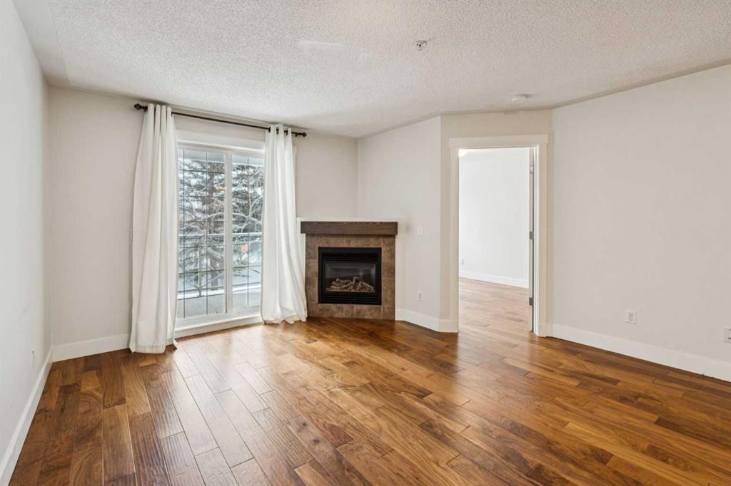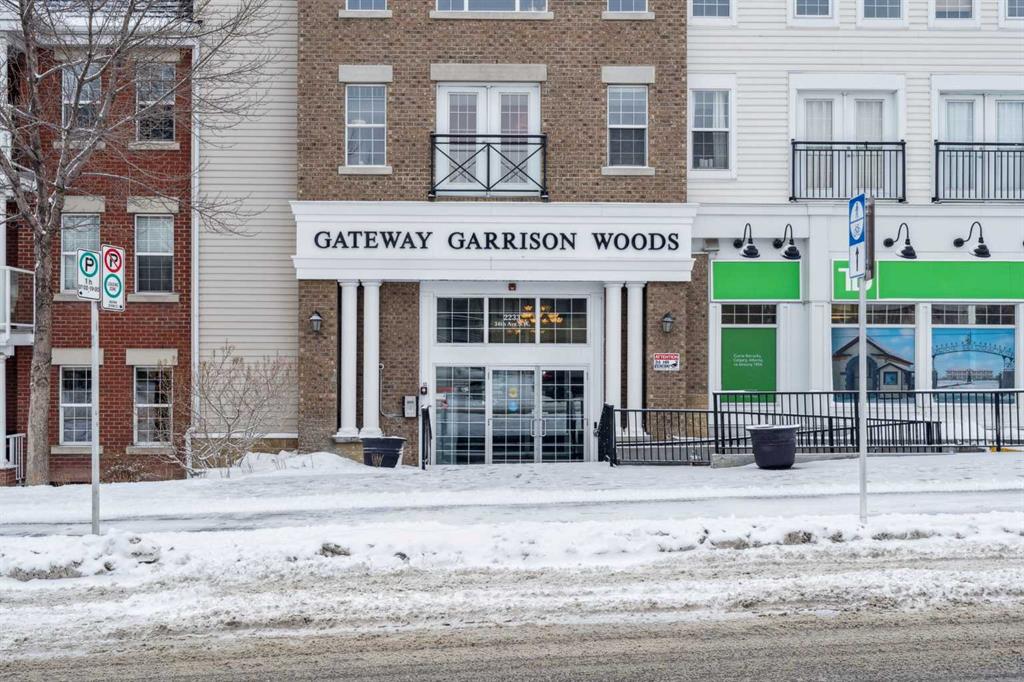 Situated in the desirable Gateway Garrison Woods complex, this open-concept home features rich walnut hardwood floors, stainless steel appliances, in-suite laundry, and a cozy fireplace that anchors the living space with warmth and character. Large windows flood the unit with natural light, creating an inviting and airy atmosphere throughout.