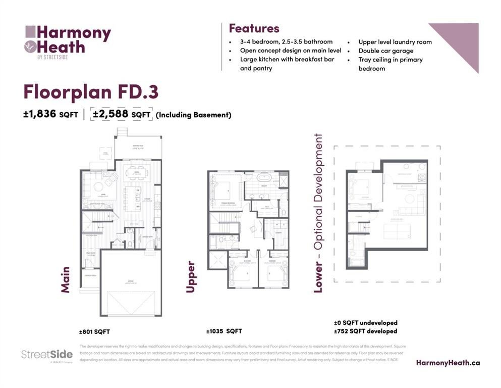This brand-new luxury townhome by Streetside Developments is coming soon to the award-winning community of Harmony, with completion early December 2025. Designed with both elegance and functionality in mind, this home offers a fresh new layout that includes a front-attached double garage, an expansive 33' driveway with plenty of room for your vehicles and a spacious backyard that backs onto greenspace near the lake, a rare find in townhome living. Built with concrete along one common wall, these homes provide exceptional soundproofing and peace of mind. Inside, the open-concept design flows beautifully from the upgraded gourmet kitchen into the dining and living areas, making it ideal for both everyday living and entertaining. The kitchen is appointed with top of the line Bosch appliances, quartz counters and backsplash, waterfall countertops, a silgranite sink, full-height cabinetry, a breakfast bar and convenient pantry. The living room centres around a gas fireplace, while the entry and powder room showcase stylish hexagon tile. Upstairs, luxury continues with upgraded LVP flooring carried right up the stairs and throughout the upper level and a stunning primary suite, in-floor heating in the ensuite with a spa-inspired design. Comfort is built in with air conditioning rough-in, while the private deck includes a BBQ gas line on your covered rear porch. Step outside to enjoy a 16’x8’ covered deck and a large, fully sodded backyard, enclosed by a privacy fence that transitions seamlessly into developer-installed wrought iron fencing along the greenspace. The basement remains undeveloped, allowing you to create the space that best suits your lifestyle. With no condo fees, National Home Warranty coverage and finishings that impress at every turn, this property sets a new bar for low maintenance townhome living. Life in Harmony offers more than just a home, it’s a lifestyle rooted in connection, recreation and natural beauty. Residents enjoy private lake access, a beach club, the Mickelson National Golf Club, an adventure park and the future Nordic Spa and Village Centre, all while being only minutes from Calgary and close to the mountains and Canmore’s endless outdoor adventures. Families benefit from a strong school system in the area, including the prestigious Edge School for Athletes just minutes away. Photos are representative of the floorplan and not the actual color palette. Additional photos show the exact selections for this unit. Please inquire today regarding all available promotions from the builder or if you would like to book a site tour. Visit the new showhome at 1176 Sailfin Heath to learn more about other opportunities in this gorgeous development.