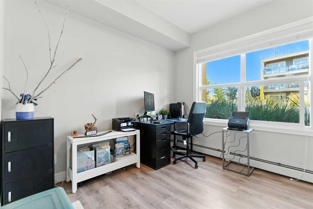 The primary suite has a walk-in closet and a 5-piece ensuite with dual vanities, a soaker tub, and a tiled shower. The second bedroom can serve as a guest room or home office, with easy access to the second full bath. Additional features include new laminate flooring in the bedrooms, in-suite laundry, heated underground parking, and a heated driveway ramp.