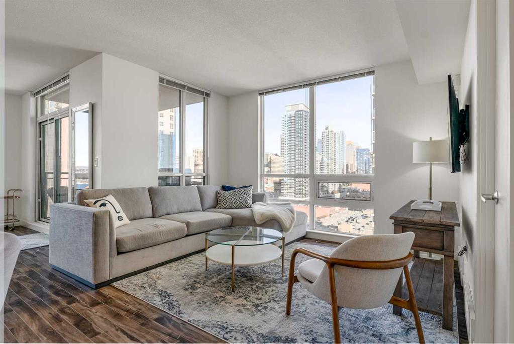 Impeccably designed and move-in ready, this stunning END UNIT in the heart of the BELTLINE offers a rare opportunity to purchase a FULLY FURNISHED home showcasing high-end pieces from POTTERY BARN and WEST ELM. Every item inside is included, creating a seamless, stylish, and effortless transition for the new owner. Expansive FLOOR-TO-CEILING WINDOWS frame sweeping CITY VIEWS, filling the open-concept living space with natural light. A PRIVATE FOYER introduces the thoughtfully designed layout, where the living room separates both bedrooms for OPTIMAL PRIVACY. The spacious living area invites relaxation with contemporary furnishings, while the dining room opens through patio sliders to a COVERED BALCONY, perfect for indoor-outdoor entertaining. A GALLEY-STYLE KITCHEN features FULL-HEIGHT CABINETRY, QUARTZ COUNTERTOPS, STAINLESS STEEL APPLIANCES, and a LARGE ISLAND with an EATING BAR that comfortably seats four. The PRIMARY BEDROOM offers a true retreat with a WALK-THROUGH CLOSET leading to a luxurious 5-PIECE ENSUITE complete with DUAL VANITY, STAND-UP SHOWER, and SOAKER TUB. A SECOND BEDROOM with DUAL CLOSETS connects to a 3-PIECE ENSUITE that doubles as a guest bath. Enjoy the convenience of IN-SUITE LAUNDRY, NEW WASHER & DRYER, and an oversized TITLED PARKING STALL located on P-1 (STALL #53). A separate ASSIGNED STORAGE LOCKER provides additional space for seasonal items. Step outside to a COVERED BALCONY with included PATIO FURNITURE and BBQ, all overlooking Calgary’s ever-evolving skyline. Building AMENITIES elevate daily life with a FULL-TIME CONCIERGE, FITNESS CENTRE with STEAM ROOM, PARTY ROOM/OWNERS LOUNGE, LANDSCAPED COURTYARD, RENTABLE GUEST SUITE, VISITOR PARKING, and SECURE BICYCLE STORAGE. Ideal for professionals, investors, or those seeking a low-maintenance urban lifestyle, this residence combines design sophistication with everyday functionality in one of Calgary’s most vibrant downtown communities.