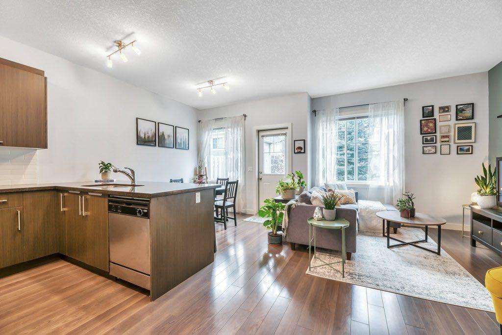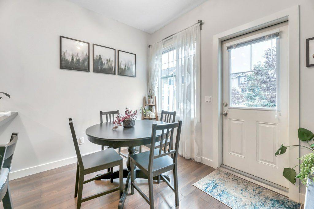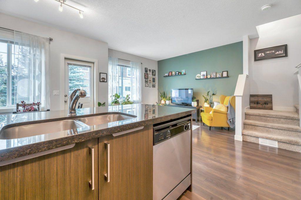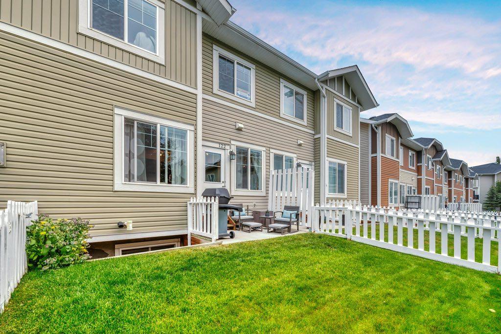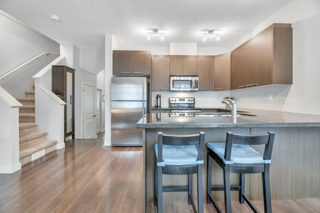 This is the one! This immaculate one owner townhome is one of only a handful of units in popular Chestermere Station with a fenced yard and full basement. You can’t beat this location with so many of Chestermere’s amenities just steps from your front door. Walk to shopping, restaurants, bars, gyms, the library and of course the lake, beach and the many picturesque parks and pathways that Westmere has to offer including an off leash dog park. The cute little covered front porch provides a touch of charm. Step into the spacious tiled front entryway with closet and a 2 pc powder room which is nicely tucked away from the main living space. Up just a couple of steps is your spacious and sunny open concept living space. The modern kitchen is well equipped with wood grain European style cabinetry, stainless steel appliances, subway tile backsplash and granite counters. Between the kitchen & dining area is a counter height peninsula with extra seating where family & guests will love to gather. You can conveniently access your back patio from the bright and cheery dining area allowing for easy BBQing year round. Other thoughtful upgrades you’ll appreciate include durable and easy care laminate flooring plus 9’ ceilings with knock down finish. Upstairs you’ll find 3 nice sized bedrooms including the primary bedroom complete with a 3 pc ensuite and huge walk in closet that even has a window. The other 2 bedrooms share the main bath with a tub which is a must have for any little ones. Upstairs laundry is another convenience you are going to love. This unit comes with a rare full basement that is ready for you to develop to suit your needs. A big window provides lots of light and means you can add a 4th bedroom if it suits your needs. The spacious yard is fenced making it perfect for kids or pets and it backs onto a grove of mature trees making this one of the most desirable locations in the community. Your fur babies are welcome in this pet friendly with board approval complex, but there’s no need to bring your shovel since snow removal and ground maintenance is included. You are going to love living here.