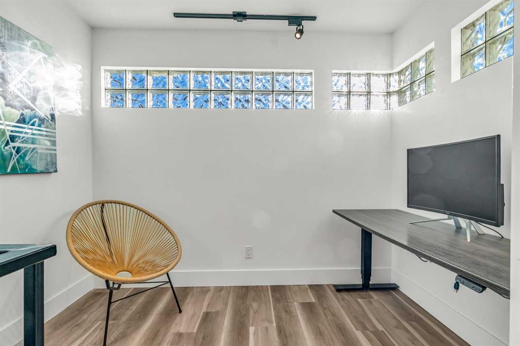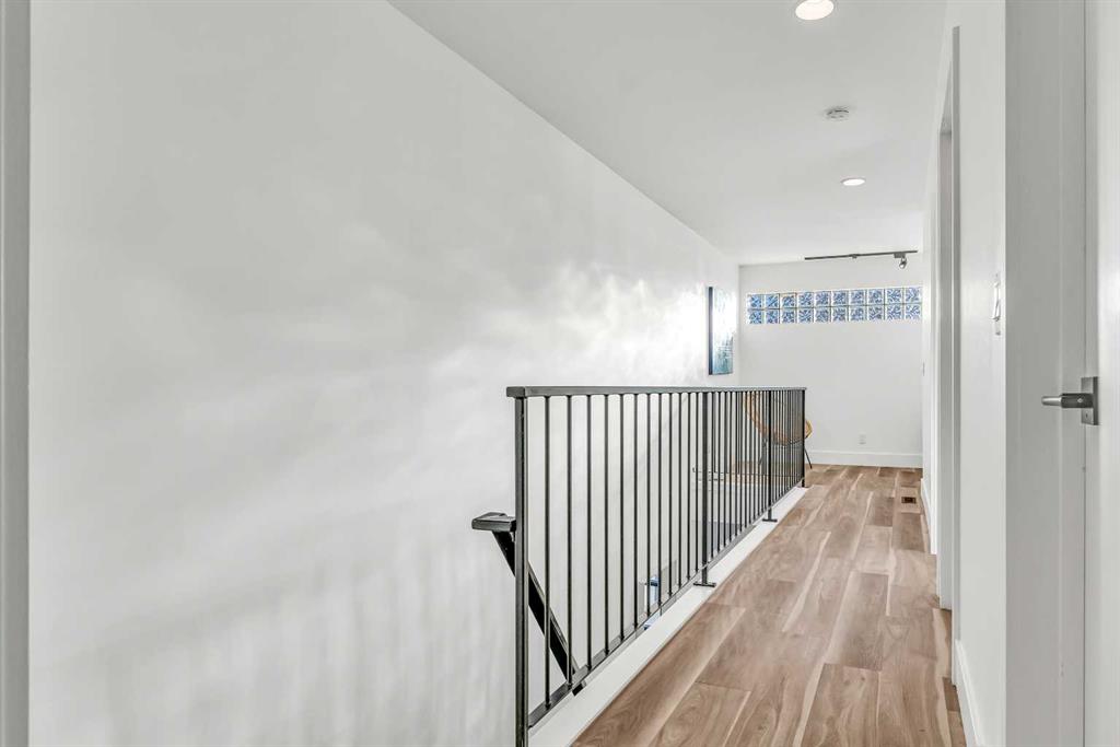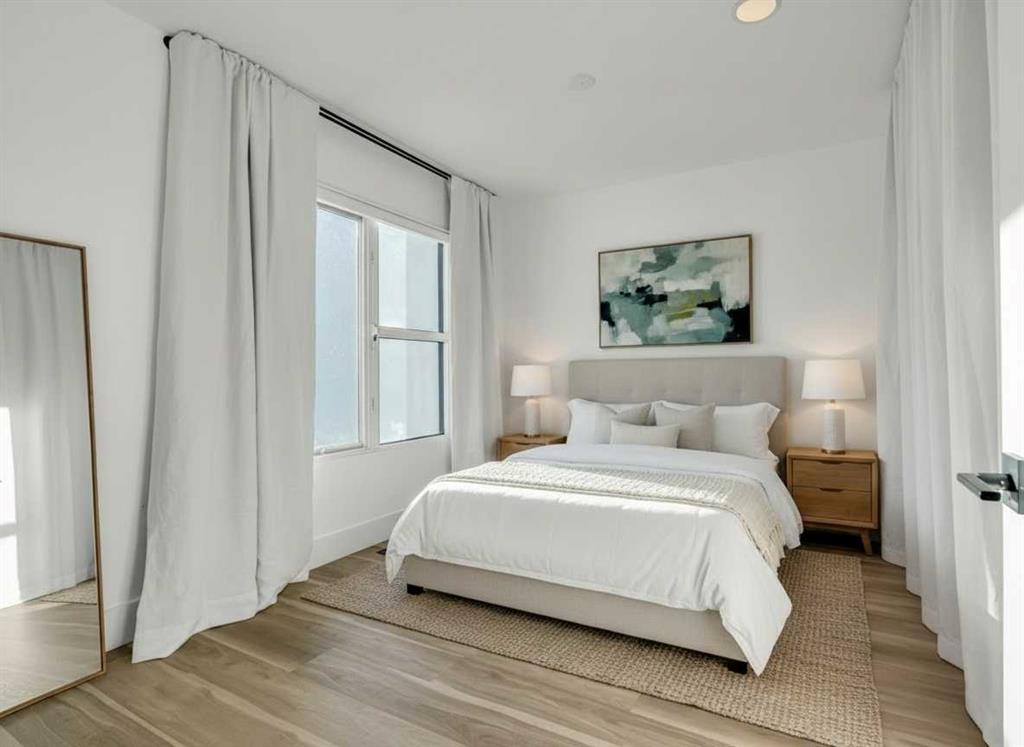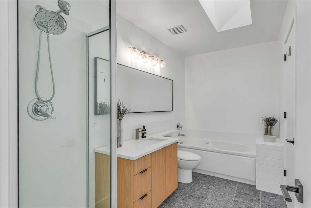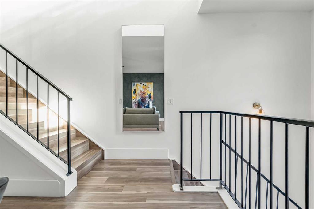 ***OPEN HOUSE: Saturday, January 24th 12:00 - 2:00 PM*** Architecturally distinct and thoughtfully renovated, this STURGESS ARCHITECTURE townhome offers refined urban living in the heart of Betline with SUNNY SOUTH EXPOSURE overlooking a quiet landscaped courtyard. Entry-level access provides a practical foyer with DIRECT GARAGE CONNECTION, creating everyday convenience while maintaining privacy from the street. The main living level is designed around an OPEN-CONCEPT FLOOR PLAN with 9’ CEILINGS and abundant natural light anchored by a dramatic two-storey window wall. The renovated kitchen blends form and function with QUARTZ COUNTERTOPS, A STATEMENT ISLAND WITH CRUSHED GRANITE SINK, FULL-HEIGHT CABINETRY, STAINLESS STEEL APPLIANCES, and A PANTRY WITH PULL-OUT STORAGE, supporting both daily living and entertaining. French doors extend the space outdoors to an OVERSIZED 177 SQ. FT. PRIVATE PATIO, ideal for relaxed evenings and summer gatherings. The main living area is centered around a TWO-SIDED GAS FIREPLACE that provides warmth and architectural interest without disrupting flow, while additional French doors open to a SECOND BALCONY overlooking the courtyard. A tucked-away powder room with stylish wallpaper completes this level. The upper floor is arranged for comfort and flexibility. The primary bedroom easily accommodates a king-sized layout and features a LARGE WALK-IN CLOSET with CHEATER ENSUITE ACCESS to the main bathroom. The 4-piece bathroom includes a STAND-UP SHOWER and A SUNNY SKYLIGHT that fills the space with natural light. The second bedroom enjoys SOUTH-FACING COURTYARD VIEWS, while an OPEN FLEX SPACE with GLASS BLOCK DETAILS creates an ideal office nook or reading area. Laundry is also conveniently located on this level. WIDE-PLANK LAMINATE AND TILE FLOORING flow throughout with NO CARPET, complemented by FLAT-PAINTED CEILINGS for a clean, modern finish. Notable upgrades include CENTRAL AIR CONDITIONING, A HIGH-EFFICIENCY FURNACE, and A NEWER HOT WATER TANK, offering long-term comfort and efficiency. Outdoor living is enhanced by TWO PRIVATE OUTDOOR SPACES. Parking is thoughtfully arranged with TWO COVERED STALLS, comprised of A PRIVATE INSULATED ATTACHED GARAGE AND A COVERED CARPORT (tandem). Located on a quiet street yet surrounded by everyday amenities, this home offers exceptional walkability with CONNAUGHT SCHOOL AND PLAYGROUND ACROSS THE STREET, easy access to parks, bike lanes, and green space, and close proximity to grocery stores, downtown, the tennis club and the shops and dining along 17TH AVENUE, delivering a highly livable and design-forward inner-city lifestyle. An exceptional setting with rare long-term upside. The adjacent street is slated for permanent transformation into a landscaped green space through an innovative public-realm project by SPECTACLE Bureau and The Tula Project, bringing ENHANCED GREENERY, REDUCED TRAFFIC, AND A CALMER STREETSCAPE that elevates both daily living and future appeal.