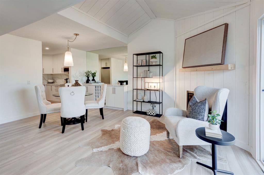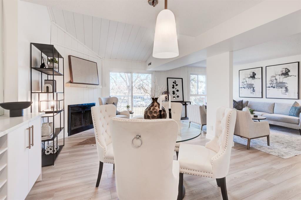 This stunning, exquisitely, expertly, renovated 1115 sq. ft. townhouse in the sought-after community of Canyon Meadows blends modern elegance with functional design. The bright, open-concept main floor showcases new wide-plank flooring, a designer kitchen with quartz countertops, a full-height quartz-inspired backsplash, gold accents, and a custom built-in nook with wine storage and extra cabinetry. Step out from the kitchen to your private deck, perfect for morning coffee or evening relaxation. Convenient in-suite laundry is also located on the main floor.
