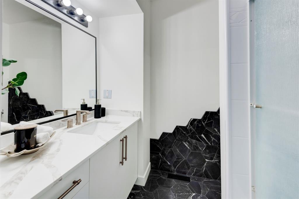As you head upstairs, a Hollywood-style staircase with new carpeting leads to two beautifully appointed bedrooms. The primary suite offers its own secondary and private deck, an ideal retreat to begin or end your day. The fully renovated bathroom features sleek tile flooring, quartz counters, modern fixtures, and designer cabinetry, evoking a spa-like atmosphere.