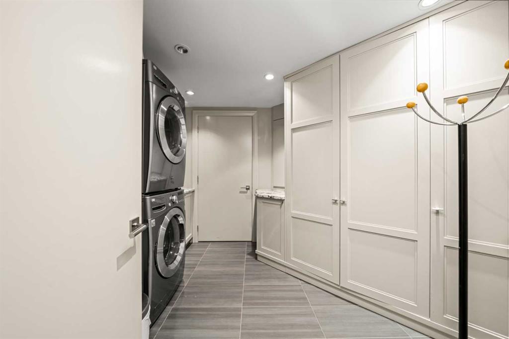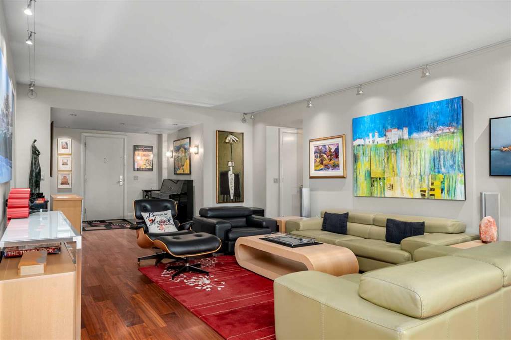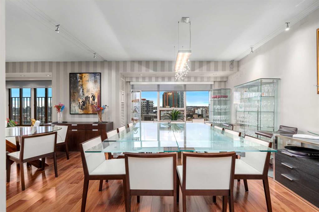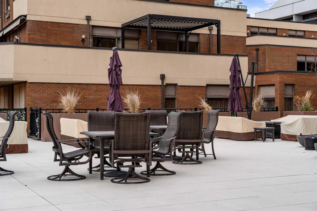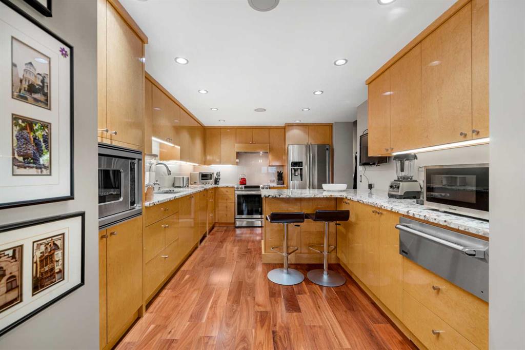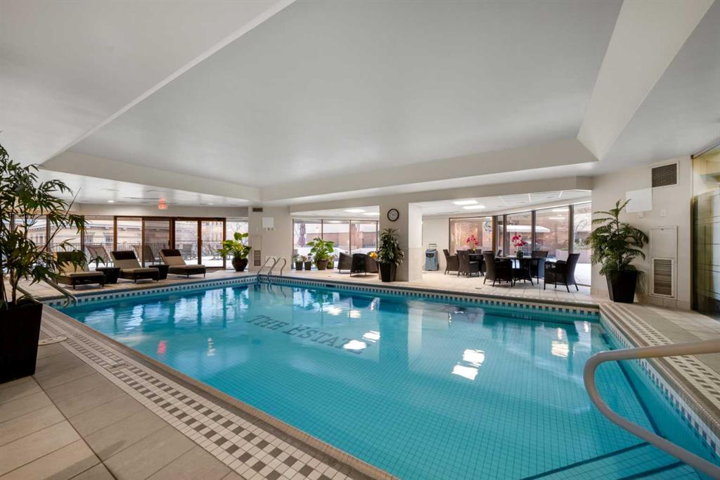 This beautiful 2022 sq ft executive condo is ideal for entertaining. Only one of three units on this floor providing a more private corridor entry that can be personalized with owner's artwork. Once you walk in, you are met with a large living room with adjoining window seating area and a breakfast nook adjoined by a large dining room capable of seating 12. The graciously sized windows boast a mountain view from the dining room. The kitchen gleams with granite counter tops and maple cabinetry. The appliances include an oven with induction top, refrigerator, dishwasher and small wall convection oven and a warming drawer. Just off the kitchen is the laundry room complete with multiple storage and adjoining room that holds a wine cabinet and a second refrigerator location. Once checking upon the primary bedroom with a massive dressing room with multiple closets and sitting area and a grand view of the Lougheed House and park below. The master bathroom consists of a large shower with steam option. The large Den doubles as a spare bedroom with a murphy bed and an office area. It has a large media center with large TV that is included in the sale. The condo is fully wired from the media closet with speakers throughout. Entertaining? There is bookable access to the indoor pool & hot tub and adjacent patio with BBQ for family and social events. Large outdoor landscaped patio for casual use and BBQing. The building is connected to the Ranchmens Club with direct access.