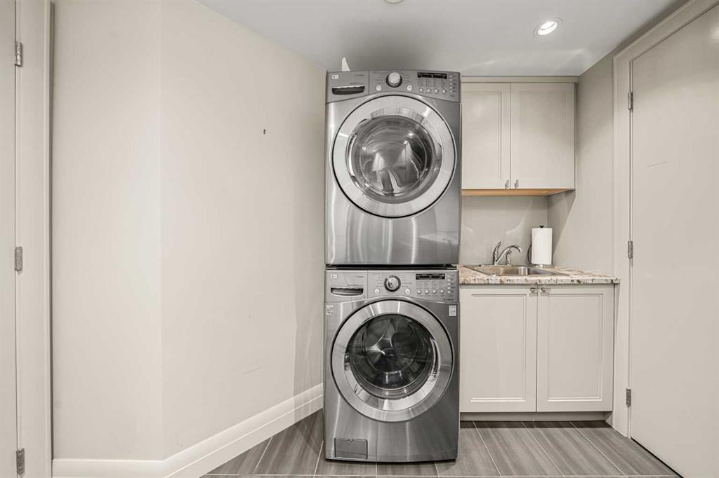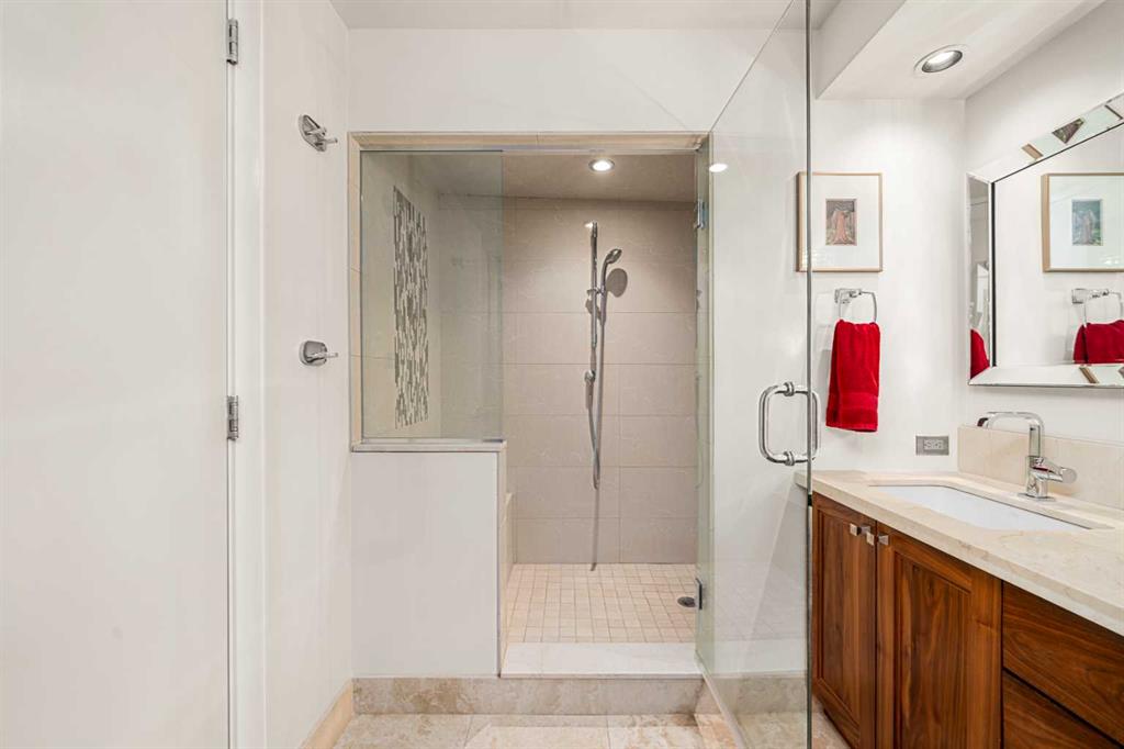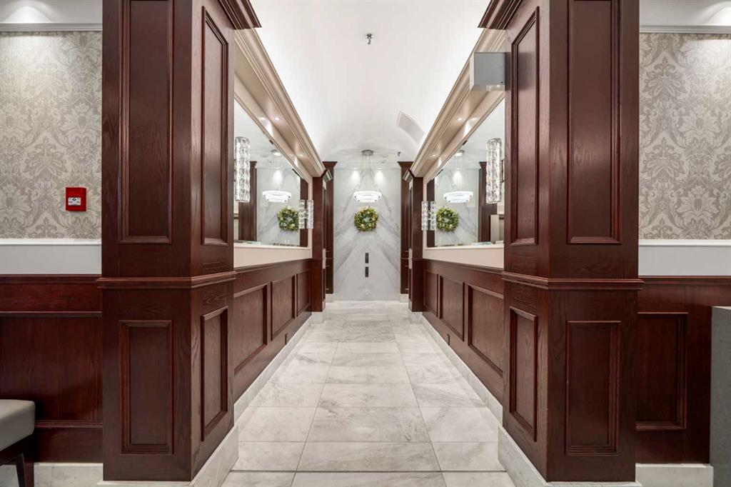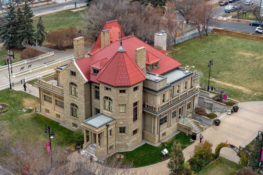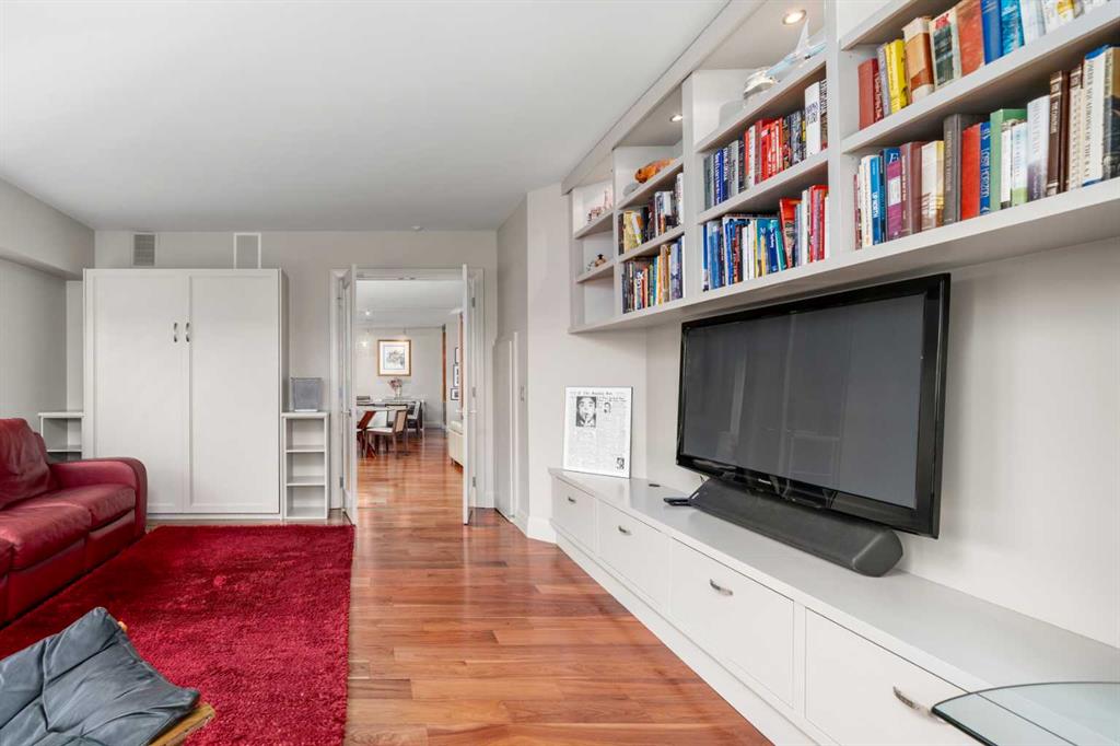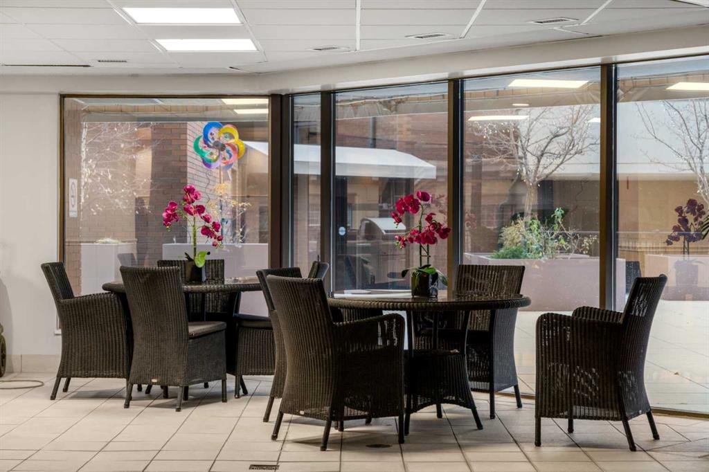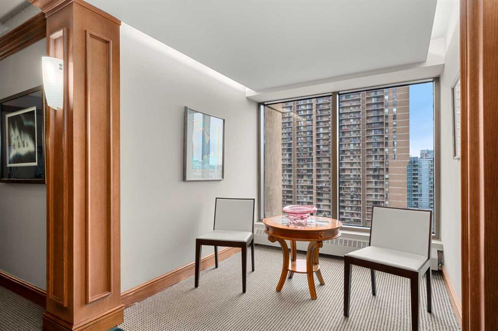 This beautiful 2022 sq ft executive condo is ideal for entertaining. Only one of three units on this floor providing a more private corridor entry that can be personalized with owner's artwork. Once you walk in, you are met with a large living room with adjoining window seating area and a breakfast nook adjoined by a large dining room capable of seating 12. The graciously sized windows boast a mountain view from the dining room. The kitchen gleams with granite counter tops and maple cabinetry. The appliances include an oven with induction top, refrigerator, dishwasher and small wall convection oven and a warming drawer. Just off the kitchen is the laundry room complete with multiple storage and adjoining room that holds a wine cabinet and a second refrigerator location. Once checking upon the primary bedroom with a massive dressing room with multiple closets and sitting area and a grand view of the Lougheed House and park below. The master bathroom consists of a large shower with steam option. The large Den doubles as a spare bedroom with a murphy bed and an office area. It has a large media center with large TV that is included in the sale. The condo is fully wired from the media closet with speakers throughout. Entertaining? There is bookable access to the indoor pool & hot tub and adjacent patio with BBQ for family and social events. Large outdoor landscaped patio for casual use and BBQing. The building is connected to the Ranchmens Club with direct access.