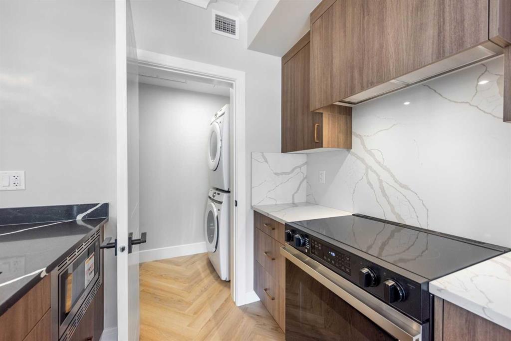 Welcome to The ORO, in Dean's Landing that redefines modern living. This brand-new, never-occupied residence features 902 sq ft of thoughtfully designed space, boasting lofty 9' to 10' ceilings and an abundance of natural light from large windows. Step outside to your own private 197 sq ft balcony, perfect for hosting summer barbecues or enjoying a serene morning coffee. The chef-inspired kitchen offers ample countertops and a dedicated pantry, while the spacious bedroom accommodates a queen-size bed with ease, complemented by a large closet. Convenience is key with in-suite laundry facilities discreetly placed away from the living areas. The unit includes a titled parking stall, and the building is secured with heated underground parking, bicycle storage, and an electric charging stations. Nestled in Rohit's Deans Landing., The unit is just moments away from shopping and dining in the award-winning University District, as well as the University of Calgary, Market Mall, Children’s and Foothills Hospitals. Enjoy nearby parks, scenic pathways, schools, and recreation centers, making this the perfect home for students, professionals, and families alike. Experience the ultimate blend of style, comfort, and convenience in University District —your new place to call home awaits! Book to view!