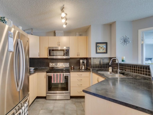 Framed by floor-to-ceiling windows on the 14th floor, this bright and inviting one-bedroom condo delivers panoramic views of the Bow River and city skyline. Natural light fills the open-concept living space, complete with a cozy gas fireplace and access to a private balcony—ideal for morning coffee or evening sunsets. The kitchen features granite countertops, stainless steel appliances, and a functional island with seating. You’ll also find in-suite laundry, central air conditioning, and a titled underground parking stall for added comfort and convenience.