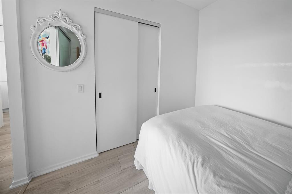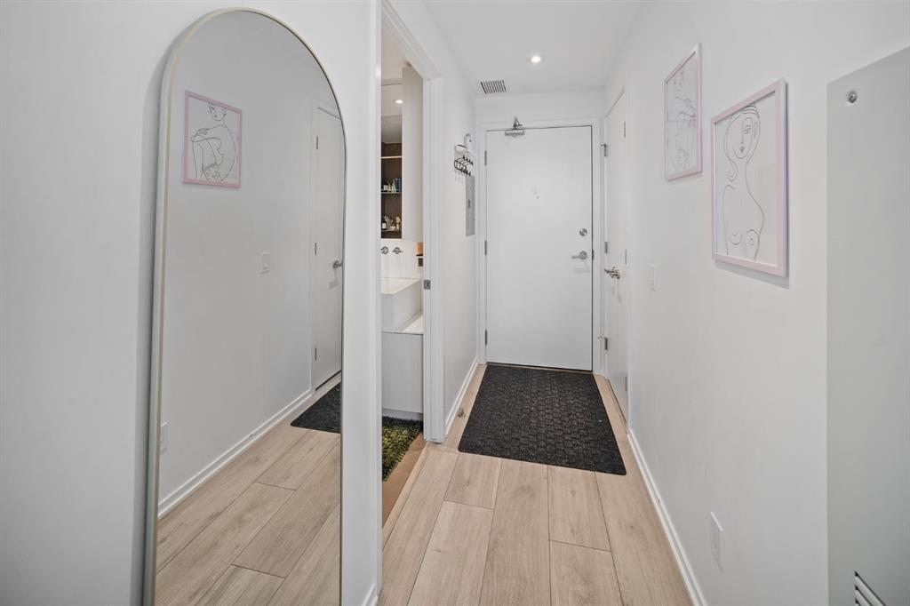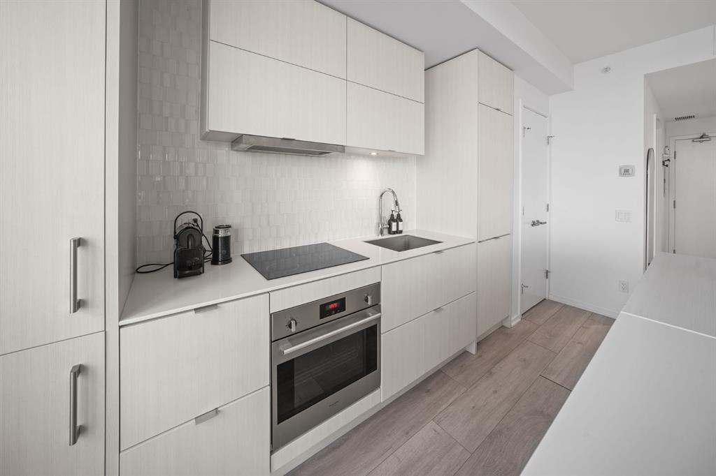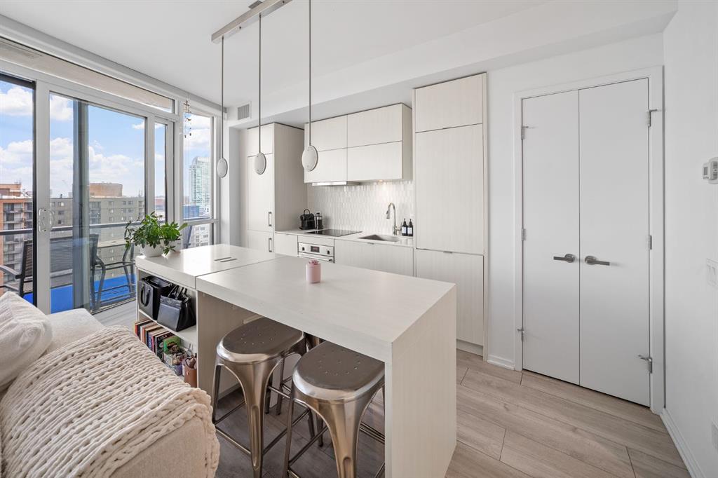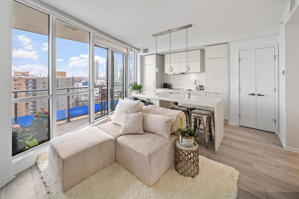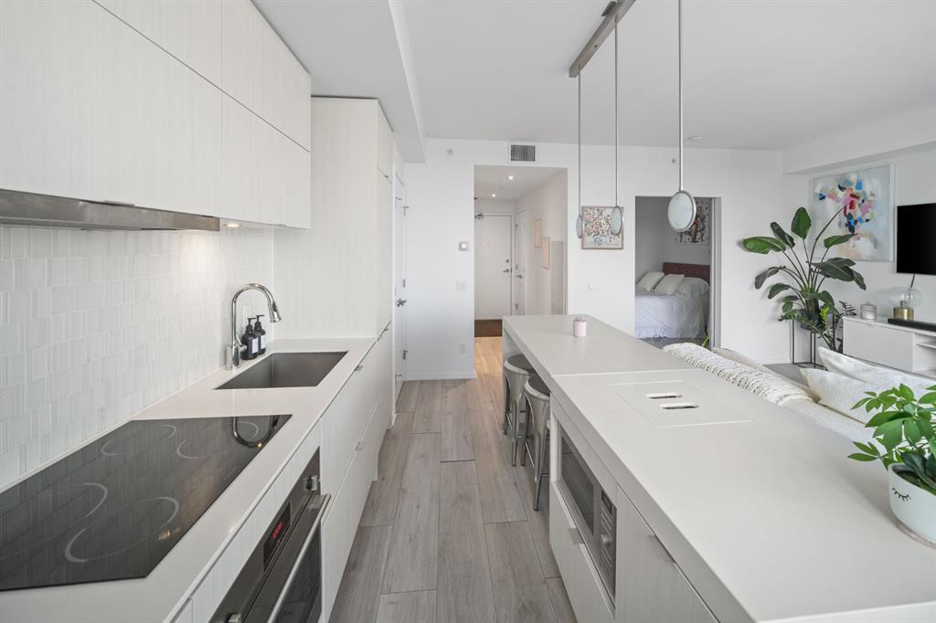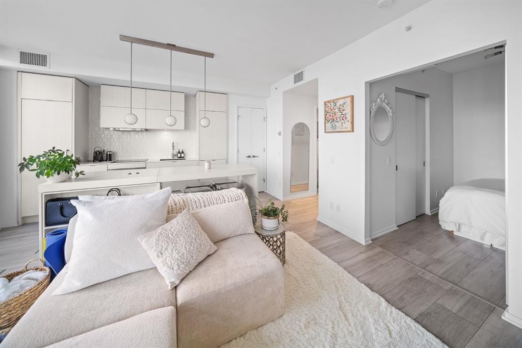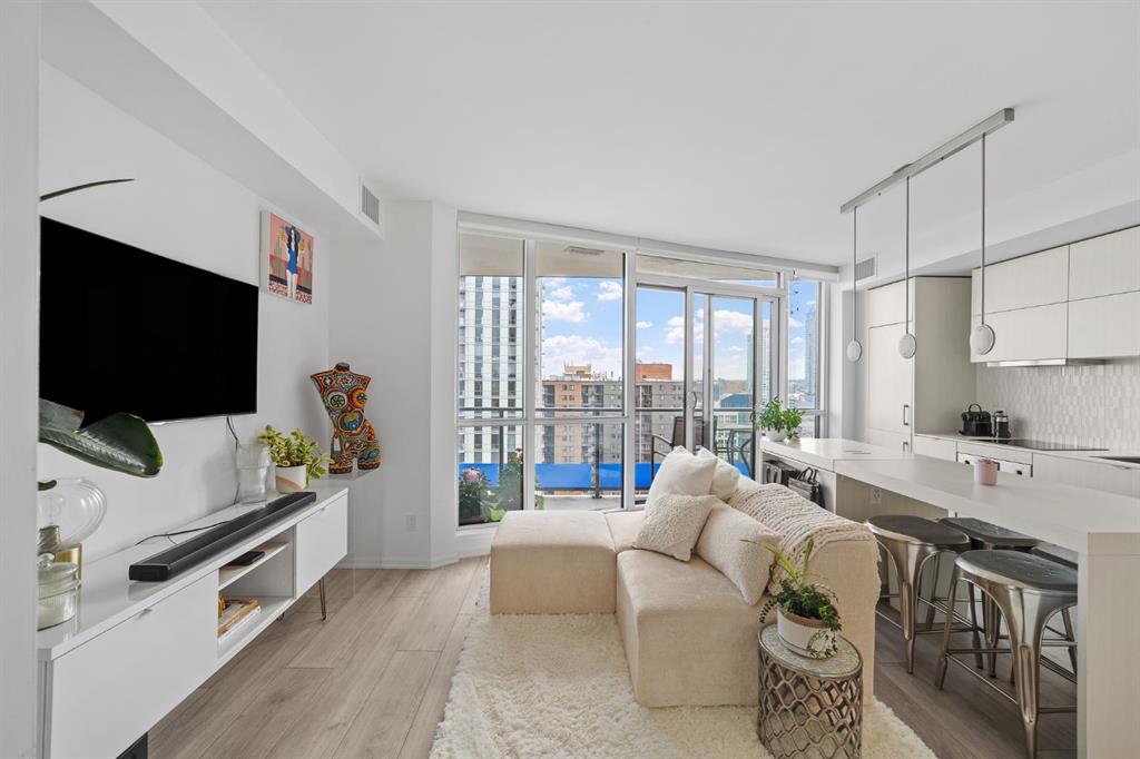Inside, you’ll find a thoughtfully designed open-concept layout ideal for both everyday living and entertaining. The sleek kitchen features white quartz countertops, integrated appliances, and a spacious island, while floor-to-ceiling windows flood the space with natural light and frame beautiful river and city views. Wide-plank flooring, designer lighting, and a generous private balcony complete the modern feel.