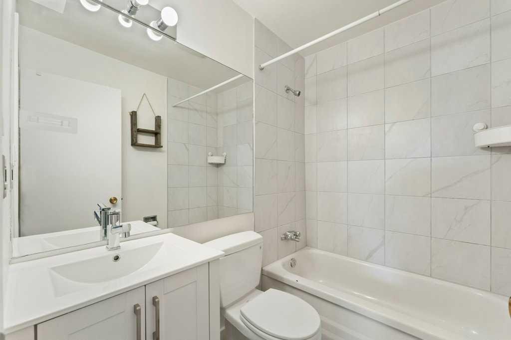 A fully renovated 4-piece bathroom with new flooring and modern tilework to the ceiling