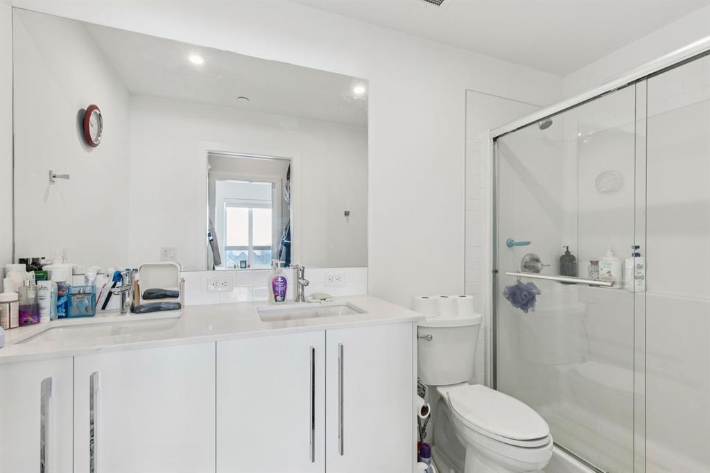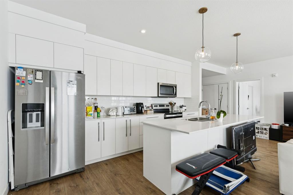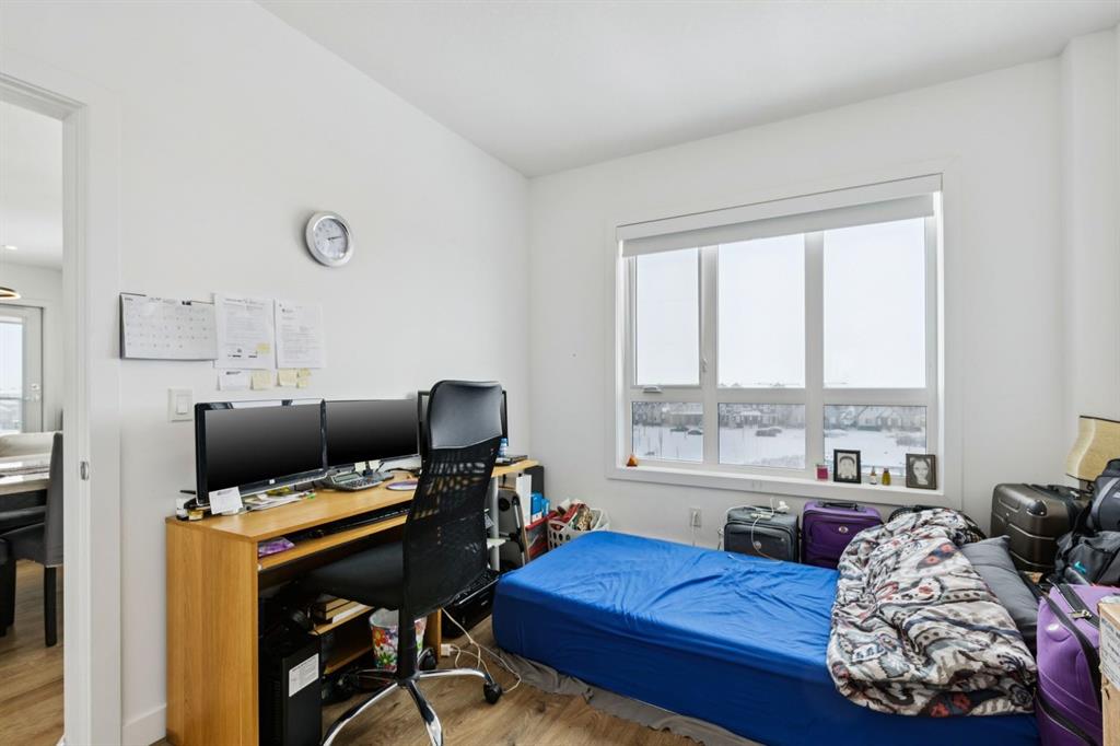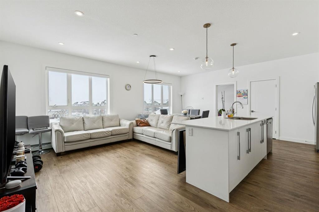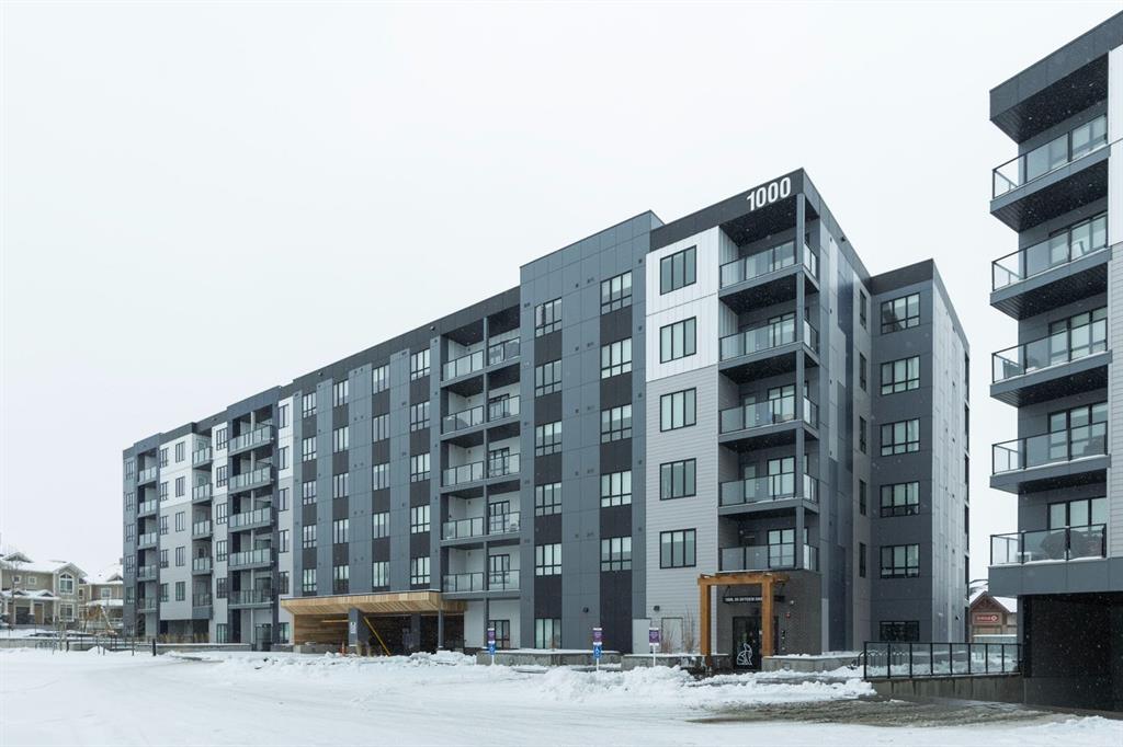 Rare opportunity to own a truly family-sized condo at an affordable price! This bright 4th floor CORNER unit with SW exposure basks in natural light all day long. This is an incredible layout with over 1,200 square feet including three generously sized bedrooms - so many options here for bigger families, multi-generational living or just space for your home office and hobbies. Plus, having TWO TITLED PARKING STALLS and plenty of visitor parking in the complex makes everyday life easy. The modern aesthetic of this unit means this unit is move-in ready from day one - stop renting and own your own home with condo fees of just $530/month. Enjoy an oversized kitchen, made for families and for entertaining with huge island, quartz counters, stainless steel appliances, pantry and chic pendant lighting. The open-concept living and dining areas can fit full-sized furniture and both look out toward the park space directly across from this unit. The oversized balcony with SW exposure is great for year-round BBQs and doesn't look toward another building, like so many condos with the fish-bowl effect. Both full bathrooms have a clean white aesthetic, with double sinks and a stall shower in the ensuite bath. This unit includes in-suite laundry, an assigned storage locker, one underground parking stall and one surface stall. The building has a secure bike storage room and is conveniently located near Metis Tr, Stoney Tr and Deerfoot Tr so you can easily get around the city, while Skyview has everything you need right in the community, from groceries to restaurants to schools (K-9 public school in walking distance!).