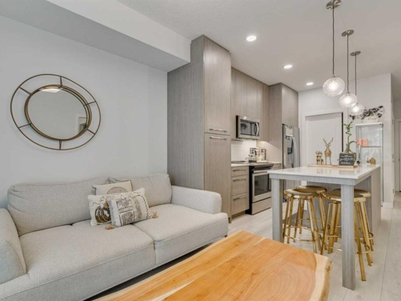 Welcome to the Charlotte by Partners Homes, a beautifully designed no-condo-fee townhome offering functional and stylish living space in the new North Calgary community of Keystone Creek. This brand new home combines thoughtful design, everyday convenience, and long-term value, all backed by the peace of mind of a new home warranty. The main floor features 9’ ceilings and a bright, open-concept layout with a rear kitchen designed for both cooking and entertaining. Highlights include upgraded MDF cabinetry, quartz countertops, a custom tile backsplash, a central island, and a stainless steel appliance package with an upgraded range. At the front of the home, the spacious dining and living areas are filled with natural light, creating an inviting atmosphere for family and guests. Upstairs, the primary suite offers a walk-in closet and a private ensuite with dual sinks and a walk-in shower. Two additional bedrooms, a full bathroom, and convenient upper-floor laundry complete the second level. The unfinished basement includes rough-in plumbing and excellent future development potential. At the rear, you’ll find a gravel parking pad with alley access. Located in Keystone Creek, one of Calgary’s newest communities, residents enjoy pathways connected to the regional trail system, naturalized wetlands, and green spaces designed for connection and exploration. Everyday amenities are just minutes away, including grocery stores, restaurants, childcare, and healthcare. Quick access to Stoney Trail, Deerfoot Trail, and major routes provides an easy commute to CrossIron Mills, downtown Calgary, and YYC International Airport. Experience modern living with timeless design in Keystone Creek. Book your private showing today and discover why the Charlotte is one of the most desirable new townhomes for sale in North Calgary!