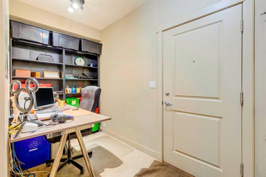This ground-floor unit offers a functional layout with defined spaces, including an area suitable for office use. It is designed for low-maintenance living and features an east-facing orientation that provides morning sunlight. The unit has direct exterior access with a front door opening to a sidewalk, allowing convenient loading and unloading. Parking is located directly below the unit and can be accessed by stairs from the rear entrance. Constructed with concrete, the building is designed to provide enhanced structural durability and acoustic separation. Mechanical and electrical systems are centralized, which may reduce the amount of in-unit equipment such as a furnace or hot water tank. Residents have access to a well-maintained 24-hour fitness facility, an interior courtyard garden, and rentable guest suites. The Garrison Green community features limited through-traffic and several nearby parks, green spaces, and walking paths. Local amenities include nearby retail areas on both the east and west sides of the community, as well as close proximity to North Glenmore Park, Rockyview General Hospital, and several shopping centres. Major roadways such as Crowchild Trail and Glenmore Trail provide convenient citywide access. Public transit options are extensive due to the community’s location adjacent to Mount Royal University, whose recreation facilities also offer public memberships. Proximity to Lakeview and Earl Grey golf courses, along with access to major roadways toward Bragg Creek and the mountains.