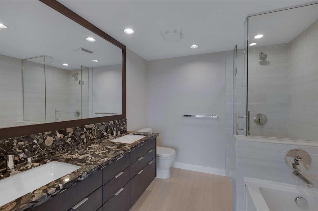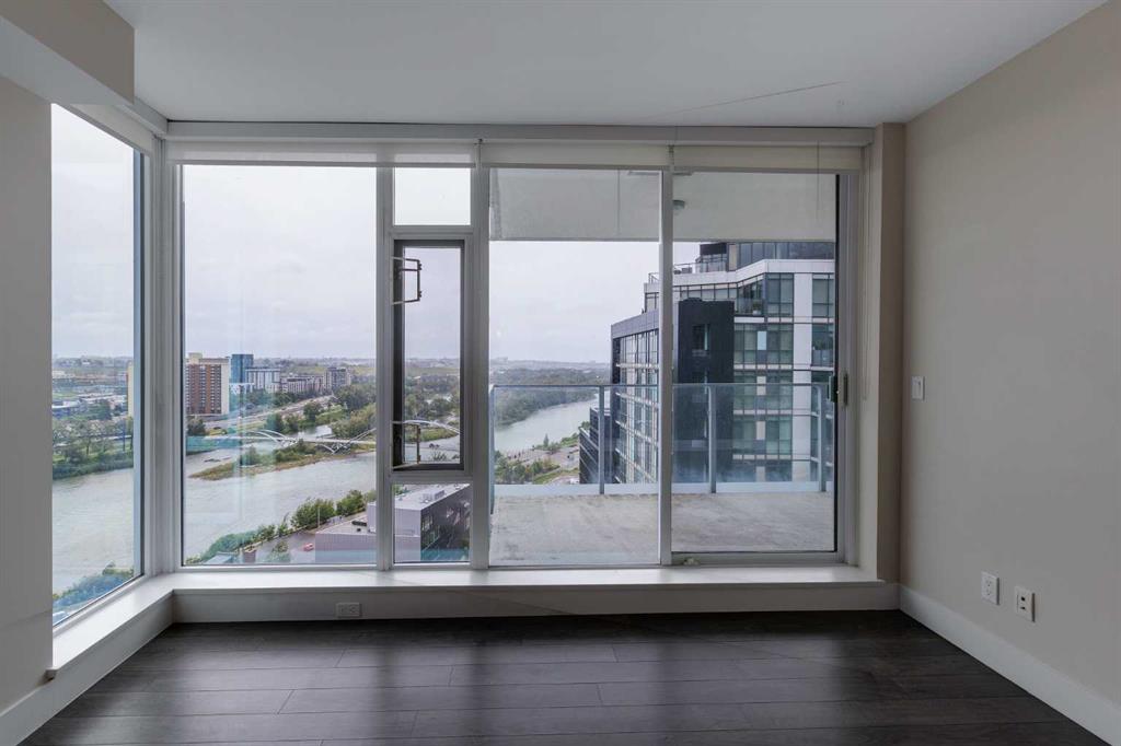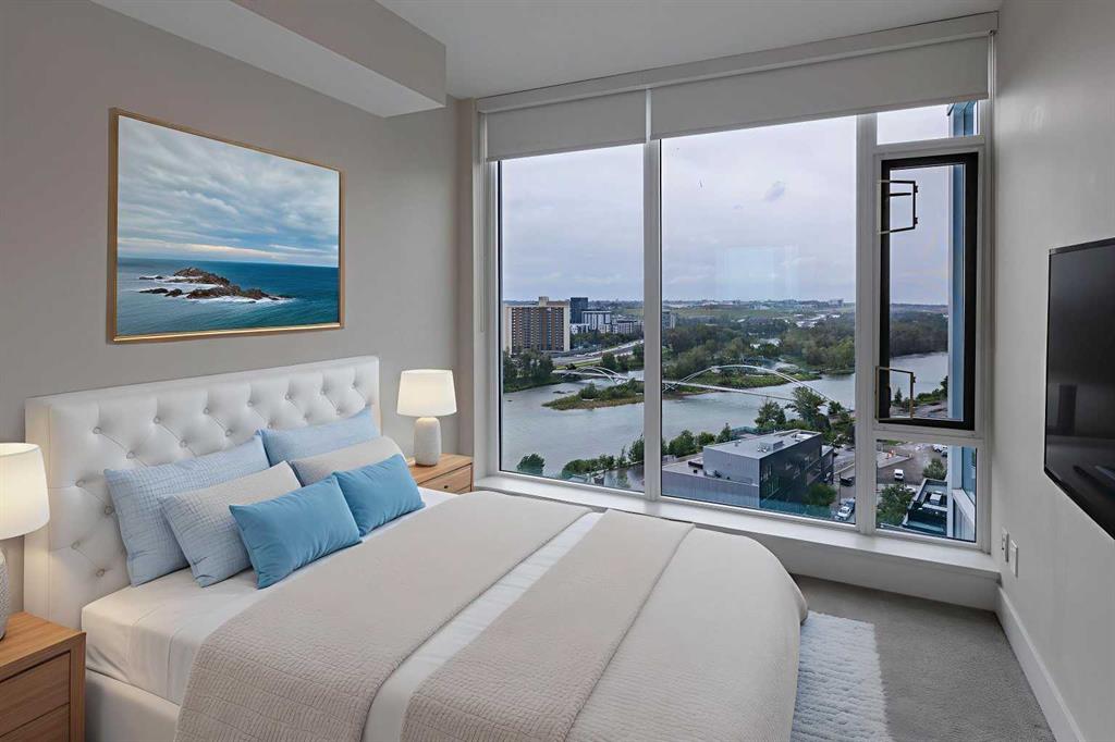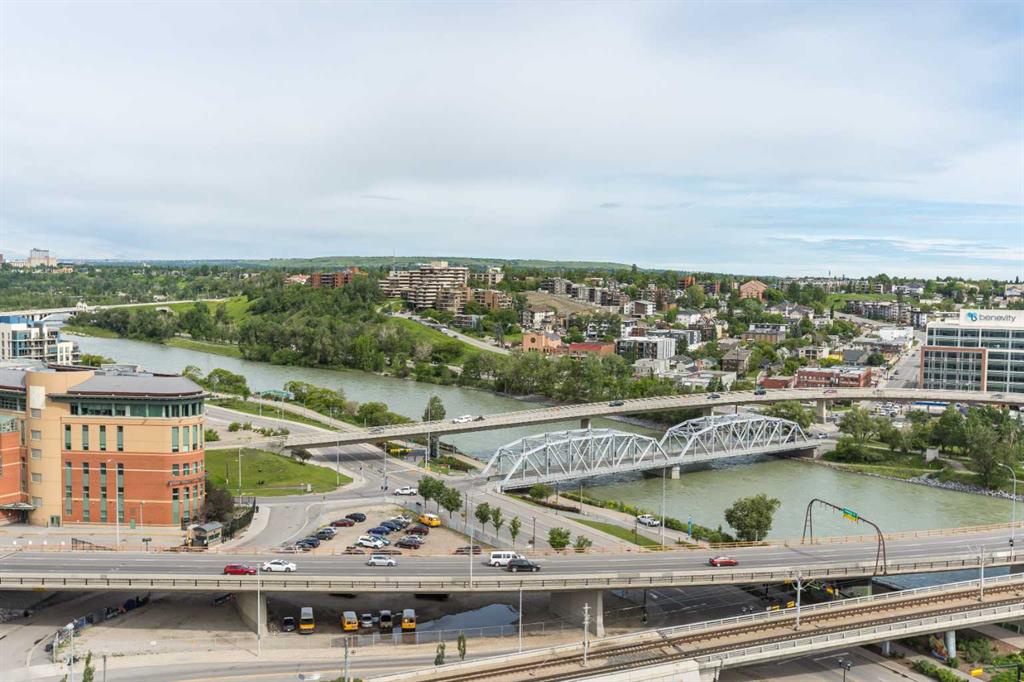 HOME SWEET HOME! Indulge in luxurious, trendy condo living with UNBEATABLE and UNOBSTRUCTED VIEWS of Bow River and St. Patrick Island in the popular Evolution building in sought-after East Village! This magnificently modern unit offers the ultimate in maintenance free living with 2 bedrooms, 2 bathrooms and 879+ SQFT of executive, stylish living space. Heading inside you will instantly fall in love with the sophisticated finishing's including gleaming luxury laminate flooring, granite countertops, in-floor heating, floor to ceiling windows to bask in your spectacular river and city views and CENTRAL AC. The open concept layout features a sun-drenched living room with huge windows showcasing your dream views, a spacious dining area/breakfast nook and the gourmet chef’s kitchen complete with premium stainless steel appliances, a center granite island with an eating bar, granite countertops, granite backsplash and tons of cabinet space. Completing the inside of the unit is a laundry closet with storage space, a wonderful 3 piece bathroom, a generous sized bedroom, the stunning primary retreat with a walk through closet and a spa-like lavish 5 piece ensuite with dual vanity sinks, a private glass surround shower and a cozy tub. The huge covered balcony with a gas hookup for the BBQ offers you an outdoor oasis to enjoy hosting guests or having a drink while basking in your breathtaking river views. Additional features include an assigned, heated, secured, underground parking stall (situated directly beside elevator doors) and an assigned storage locker. You get exclusive access to amenities such as a fitness center with a sauna and a steam room, concierge, party room and an incredible rooftop patio/garden area. Pets allowed(Dog or 2cats). Steps from unrivaled amenities and Downtown Calgary hot spots, desirable restaurants, coffee shops, Bow River pathways, Central Library, Studio Bell, Fort Calgary, a shopping centre with a Superstore, major roadways and much more! Pet friendly with board approval. This condo is a MUST VIEW! Book your private viewing today!