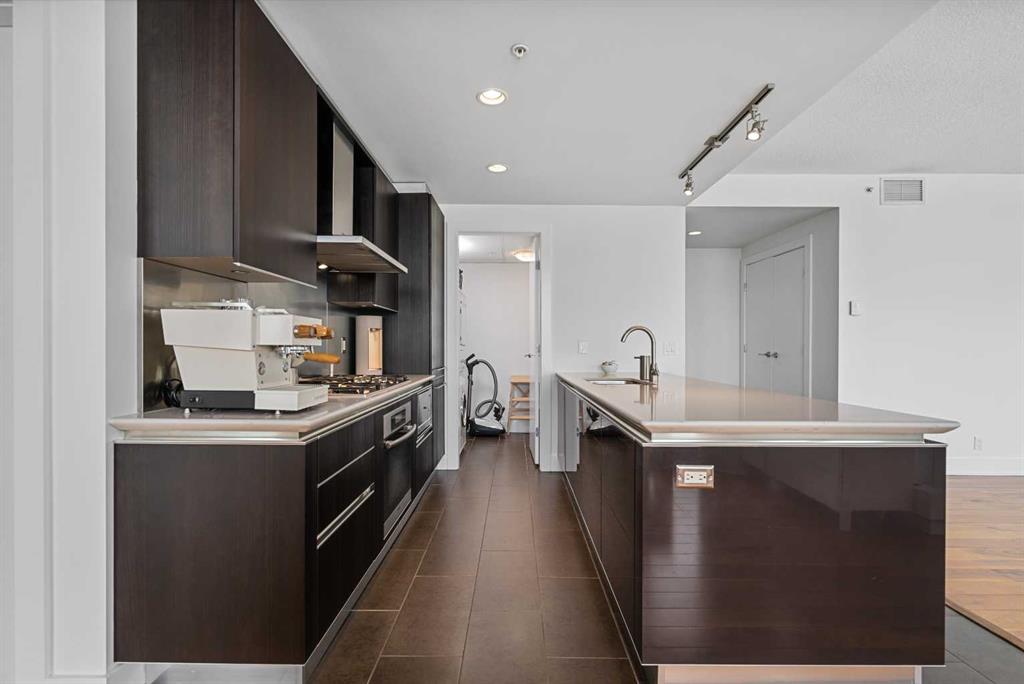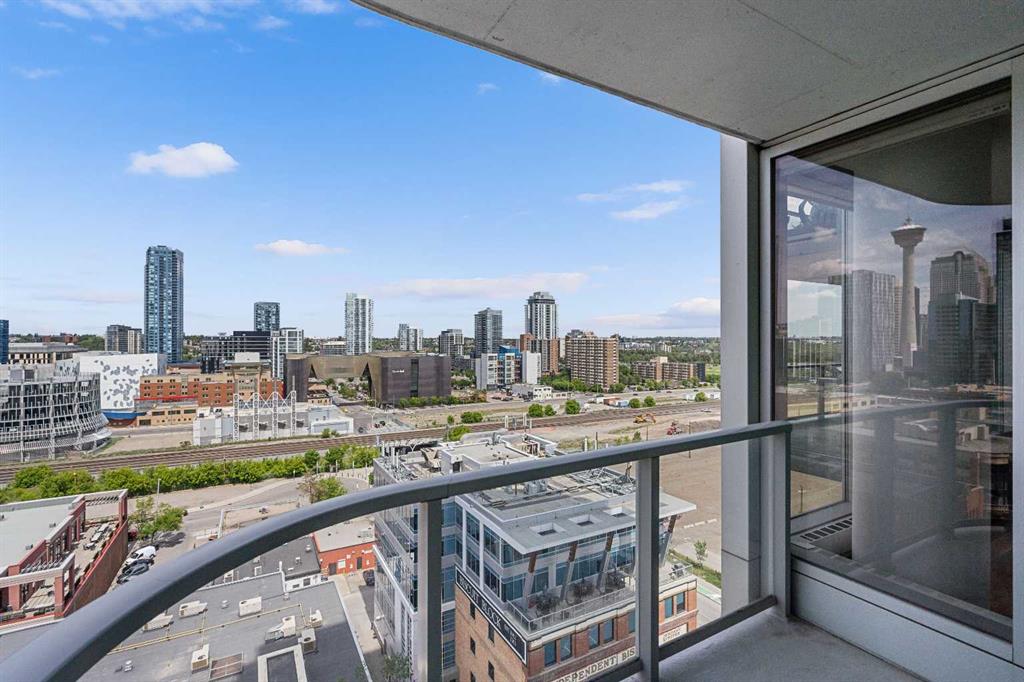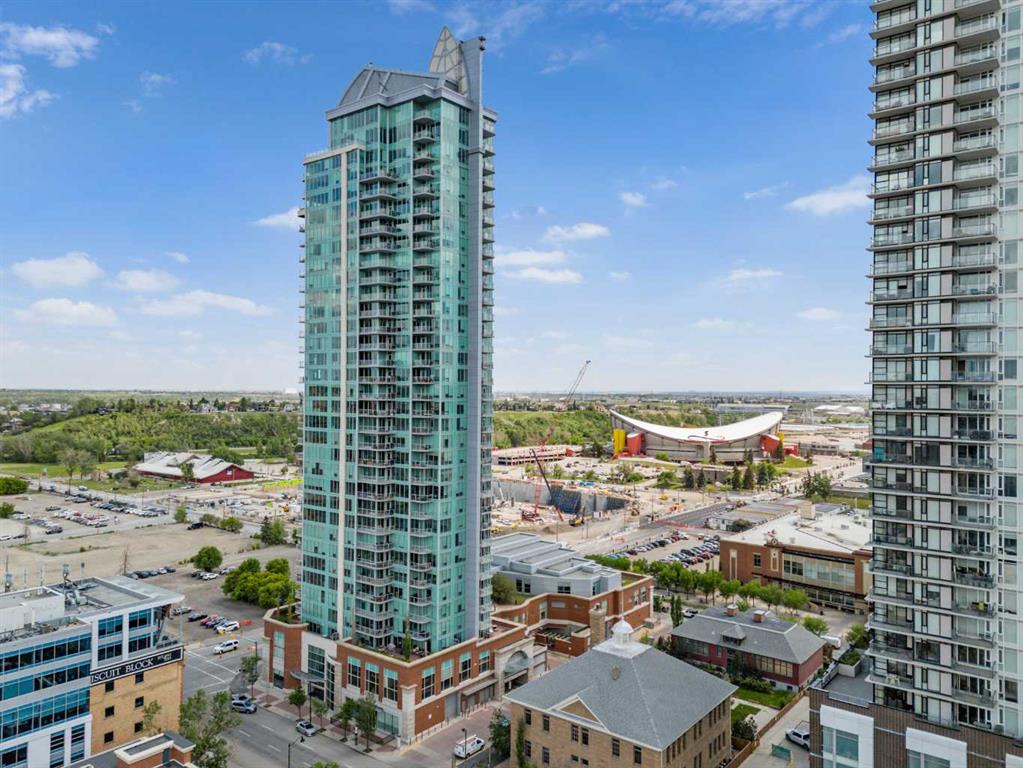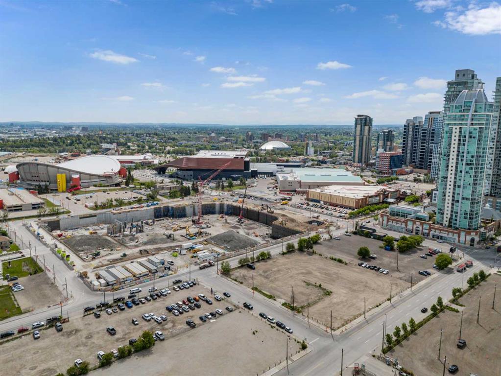Welcome to Arriva — where refined urban living meets one of Calgary’s most exciting new developments. Located in the heart of the Beltline, this expansive 1193 sq. ft. corner unit offers 2 bedrooms, 2 bathrooms, titled underground parking, and stunning skyline views. Situated directly beside the future Calgary Event Centre, this is a rare opportunity to live next to the city’s most anticipated entertainment district. Step into an open-concept layout with soaring 9’ ceilings, central air conditioning, and approximately 19 feet of floor-to-ceiling windows that frame panoramic views from the Calgary Tower to East Village. Enjoy summer evenings on your private balcony, complete with a gas line for BBQs. The kitchen is a chef’s dream, featuring a premium Miele appliance package, including a 5-burner gas cooktop, stone countertops, a large peninsula island, and a spacious pantry. A generously sized dining area flows seamlessly into the bright and airy living space — perfect for entertaining. The primary bedroom retreat includes its own private balcony, a custom walkthrough closet, and a spa-inspired 4-piece ensuite with separate glass shower and deep soaker tub. The second bedroom also offers a custom walkthrough closet with direct access to a cheater ensuite — ideal for guests or a home office. Additional features include a titled underground parking stall, an assigned storage locker, and access to Arriva’s premium amenities — including full-time concierge/security, an elegant lobby and premium social room with a beautiful outdoor patio. This is downtown living at its finest, with unbeatable access to transit, dining, entertainment, the Stampede Grounds, and the upcoming arena.