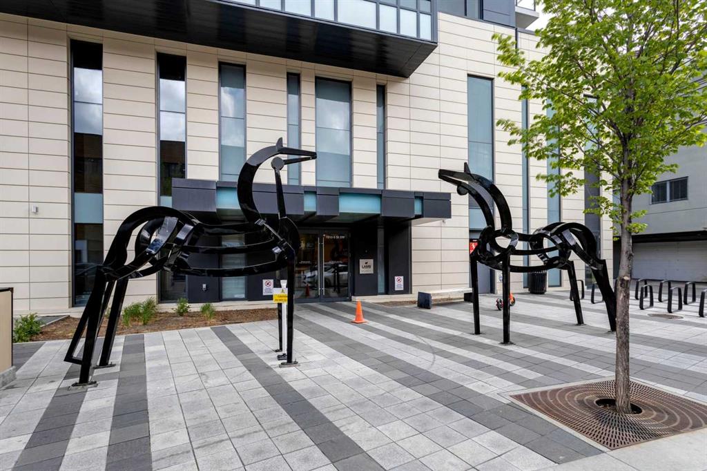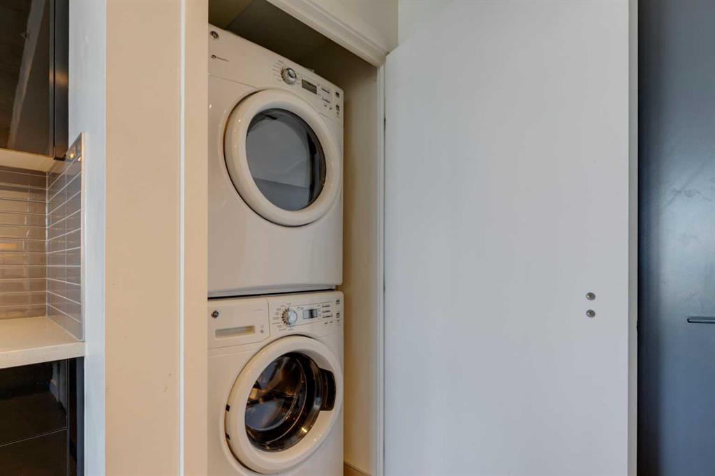 Enjoy this super bright one bedroom plus den condo on the 19th floor at 6th and Tenth. This condo offers a lucrative and highly sought-after short term rentals. The 9-foot ceilings and an open plan create a sense of space and light. Views are beautifully framed by the huge windows and the Impressive concreate ceilings and walls. An open concept kitchen offers high end appliances, gas stove and an extra-large island. A large den also accommodates a home office or dining room table. The bedroom has beautiful views and a good-sized closet. There is also a stylish 4-piece bathroom, front entry closet and in suite laundry. The large NW balcony is awesome for outdoor living with a gas hook up for a BBQ and there is plenty of space for outdoor furniture to enjoy the views. The parking stall and storage unit are conveniently close to the elevator. This well run condo offers part time concierge service from 8am to 6pm, a well equipped gym, party room and an outdoor pool area. Easy walk to downtown, 17th Ave and transit from this great beltline property.