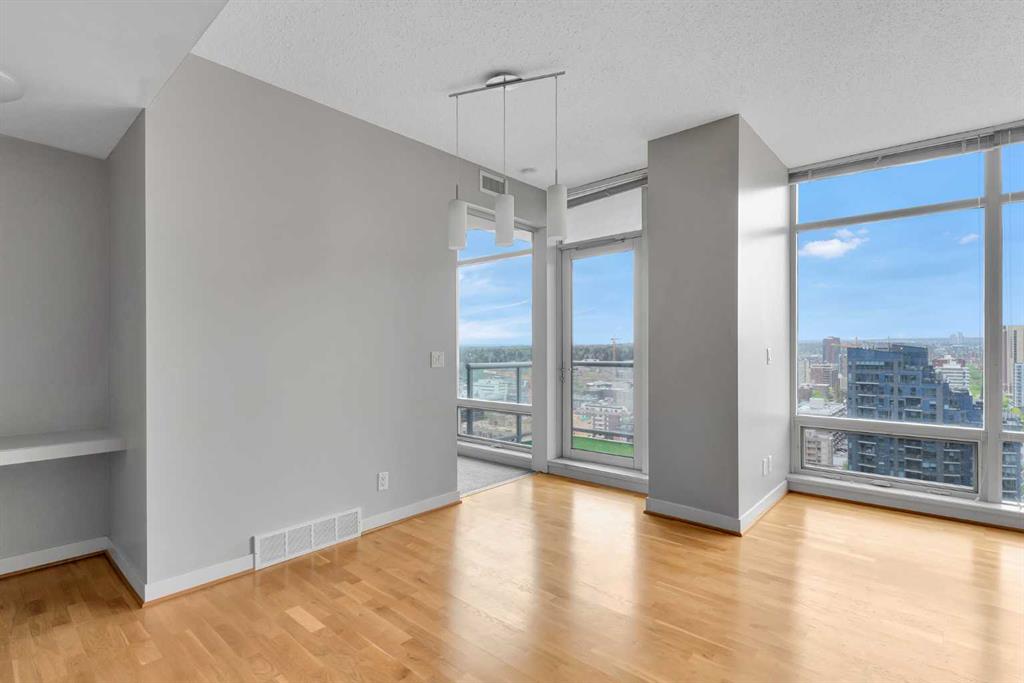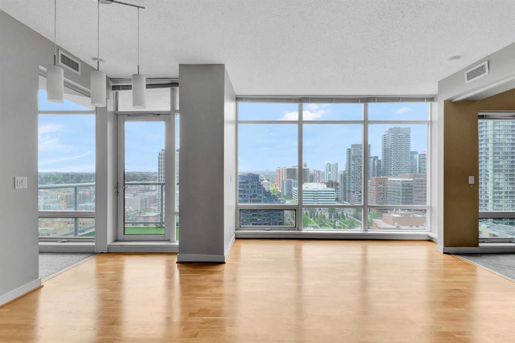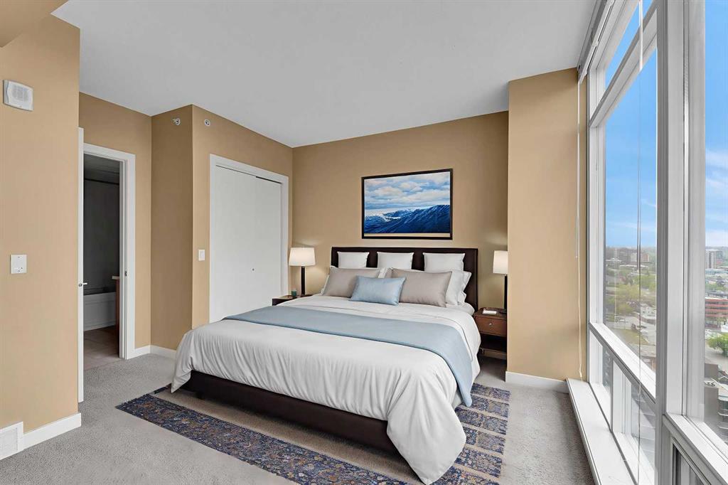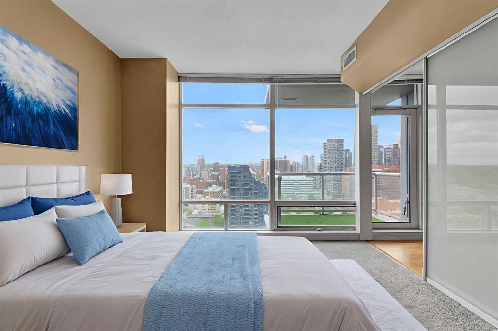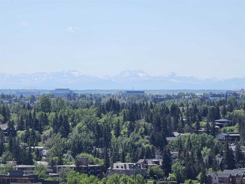 Welcome to Unit 1903 at Union Square, a bright West facing suite with floor-to-ceiling windows with views of Haultain Park, the Rockies, Calgary Tower and downtown. Featuring U/G Parking and Central A/C the open floor plan boasts durable laminate flooring in the living room and kitchen, soft carpet in each bedroom and tile in both bathrooms. Sliding glass doors—full height in both bedrooms—let in plenty of light and place the bedrooms on opposite sides of the suite for extra privacy. The kitchen has stainless-steel appliances, a large island for meals or get-togethers and a built-in nook that’s perfect for a home office. Step out onto your private balcony—with gas BBQ hookup—and take in the park below, complete with tennis courts, a playground and mature trees. The primary bedroom includes a walk-in closet and spa-style ensuite, while the second bedroom offers cheater-ensuite access to the other full bath. You’ll also have in-suite laundry, secure underground parking and your own storage locker. Just downstairs, the Union Square Food Hall brings a variety of dining options right to your doorstep. With a Walk Score of 93, you’re steps from the C-Train, river pathways, the Stampede Grounds and all the shops and restaurants downtown. Urban living at its best!