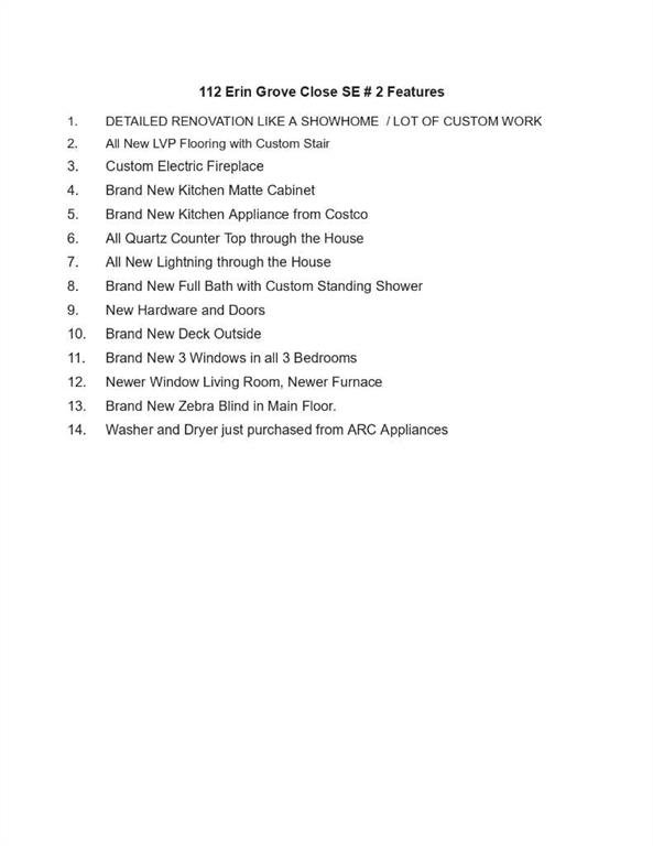 PRICE TO SELL | DETAILED RENOVATION LIKE A SHOWHOME | LOT OF CUSTOM WORK | All New LVP Flooring | Custom Electric Fireplace | Brand New Kitchen Matte Cabinet | Brand New Kitchen Appliance from Costco | All Quarzt Counter Top through the house | Custom Standing Shower | New Hardware and Doors | Brand New Deck | Brand New 3 Windows in all 3 Bedrooms | Newer Window Living Room | Newer Furnace | Brand New Zebra Blind in Main Floor. Welcome to #2, 112 Erin Grove Close SE, a 3 bedroom 1.5 bath two-storey townhome nestled in the heart of Calgary’s Erin Woods community. This home has been fully renovated from top to bottom with premium materials, exceptional craftmanship, functional and style. Luxury vinyl plank floor throughout the house, brand new bedroom windows, brand new kitchen cabinets brand new appliances and bathroom amenities, new deck. Back lane is accessible with one assigned parking slot, and lots of parking right in front of the house. On entering the main foyer, you will find a bright living room, with large windows and a stylish fireplace providing a cozy and modern feel. Kitchen has been fully renovated with quartz counter top, with a large windows overlooking the deck and backyard. Upstairs boasts 3 good sized bedrooms and a full bathroom with modern lights and standing shower. The basement is spacious and not finished, awaiting your personal touch. Located in the tranquil Erin Woods neighborhood, this home is just minutes from schools, parks, shopping, and offers easy access to Deerfoot and Stoney Trail, making commuting a breeze. The area is known for its quiet streets and abundance of green spaces—ideal for families and outdoor enthusiasts. Affordable and move-in ready, this house is a gem and can't be missed. Book your showing today before it's gone.
