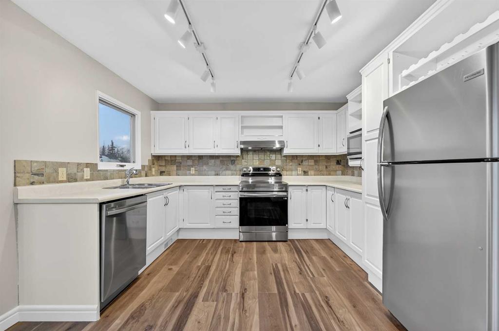 Welcome to this charming split-level townhome in the sought-after Woodlands on The Park condo community. Backing right onto the serene Fish Creek Park, this community offers the perfect blend of urban convenience and nature's tranquility – imagine morning walks along the trails or picnics just steps from your door. Step inside to over 1,600 square feet of thoughtfully designed living space that's been freshly updated and feels bright and inviting. The main level greets you with a spacious living area boasting soaring high ceilings, oversized windows that flood the room with natural light, and a cozy stone-surround gas fireplace – ideal for those chilly Alberta evenings. The new vinyl plank flooring ties everything together beautifully, while fresh paint, new baseboards, and updated lighting fixtures throughout add a modern touch. The kitchen is a real standout: roomy and airy with plenty of windows, a newly flat-painted ceiling, stainless steel appliances including a brand-new stove, dishwasher, and hood fan, plus a stylish tile backsplash. The cabinetry has been refinished in crisp white, offering tons of storage for all your cooking essentials. Right off the kitchen is a convenient breakfast nook, perfect for family meals or entertaining friends. Around the corner, you'll find a versatile loft space overlooking the living area – great for a formal dining area, home office, reading nook, or play area – and an updated two-piece bath for added convenience. Head up the open-riser staircase to the upper level, where the primary bedroom awaits. It's generously sized with his-and-hers closets and a four-piece ensuite featuring a granite countertop and tiled surround bath/shower combo. Two more good-sized bedrooms provide ample space for kids, guests, or hobbies, sharing a four-piece bathroom that's been updated with a new granite vanity, flooring, toilet, and lighting. Don't miss the large linen closet for all your storage needs. Downstairs, the unfinished basement with crawl space offers plenty of room for storage or future development – think gym, hobby room, or whatever suits your lifestyle. Outside, enjoy your private back deck for summer barbecues, and park with ease in the attached heated single garage. Plus, the complex got a big exterior makeover over the past few years! The roadways are freshly paved, new roof shingles, composite siding, eaves, soffits & downspouts. Location-wise, you're in a prime spot: steps to Fish Creek Park, walking distance to Woodbine Athletic Park for sports and recreation, Woodbine Square Shopping Mall for all your shopping and dining needs, and both Woodlands School and Woodbine School for families. Plus, it's just a short drive to Anderson Road and Stoney Trail, making commutes a breeze.
