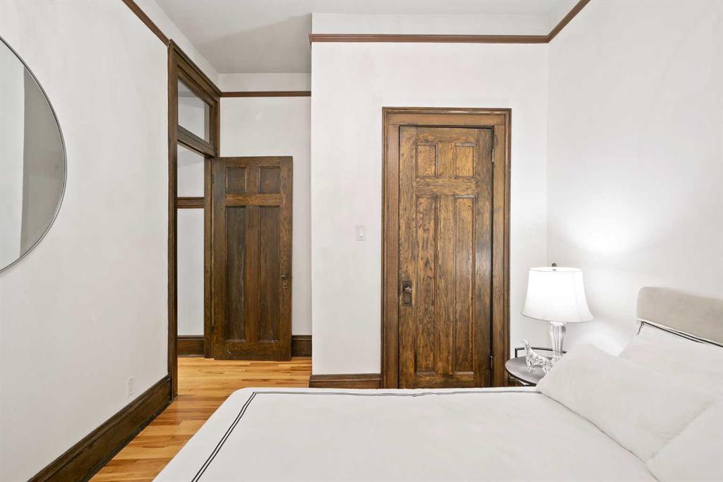Inside, the home showcases professional plaster repair and fresh paint throughout, preserving heritage detail while presenting a polished finish. The bathroom has been updated with new grout, polished and sealed tile, a pedestal sink, and period-inspired vintage lighting. In the bedroom, a Schonbek crystal chandelier adds a touch of timeless elegance, creating a warm and sophisticated retreat.