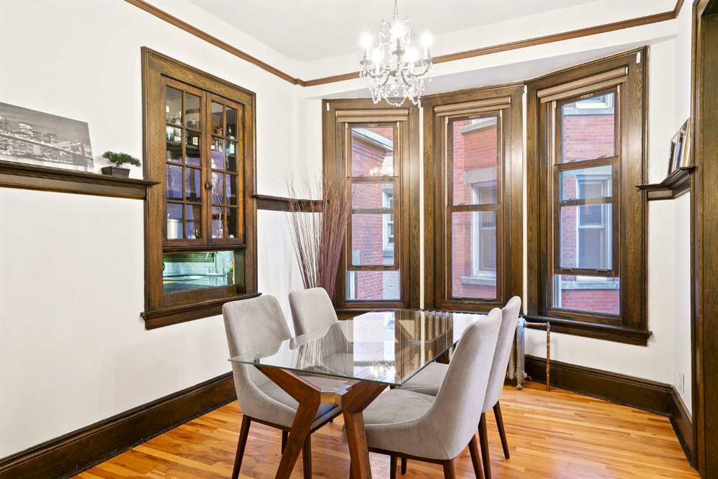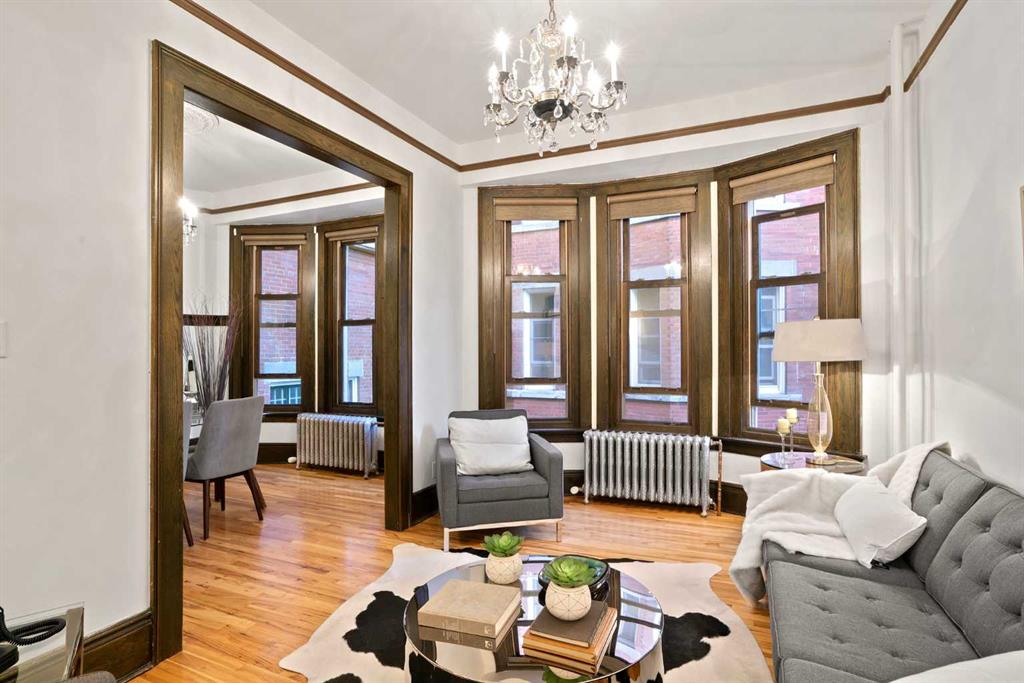 Other highlights include 10’ ceilings, granite kitchen counters, custom maple cabinetry, in-suite laundry, and the original cast iron clawfoot tub. The formal dining room retains its historic built-in china cabinet, while the spacious living room offers views of brick and sandstone along with potential for a second bedroom conversion.
