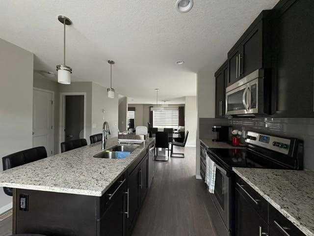 The ground level welcomes you with a spacious foyer, a versatile den perfect for a home office or flex space, and direct access to the double garage. Upstairs, you'll find an open-concept main floor featuring a stylish kitchen with granite countertops, modern cabinetry, stainless steel appliances, and a central island—ideal for cooking and entertaining. The bright living and dining areas offer access to a private balcony, and a convenient 2-piece powder room completes the level.