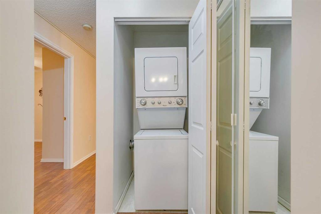 Welcome home to this bright and inviting, 2-bedroom, south-facing condo , drenched in natural light from morning to evening. Enjoy the generous balcony overlooking mature trees that provide both privacy and a lovely, peaceful outdoor view. Stay cool during warm summer days with the added comfort of AIR CONDITIONING, the functional floor plan includes a full in-suite laundry area with stacking washer/dryer and a large storage room to keep everything organized. The pride of ownership is evident - this freshly painted unit is exceptionally well cared for. Attractive laminate flooring spans the home, and the kitchen features tasteful cabinet and countertop updates, along with quality appliances including a Whirlpool microwave and fridge, Maytag stove, and Frigidaire dishwasher. A spacious front coat closet adds even more convenience. Both bedrooms are well-proportioned, and the bathroom offers excellent storage options , this is a rare find. Located in Dover, this condo provides quick access to Deerfoot Trail for an easy 10–15 minute commute into downtown or to other major areas of the city. You are also just moments from the ridge and a short walk to the Bow River pathway perfect for nature lovers, cycling, and daily walks. Nearby Co-op shopping adds to the convenience. The complex boasts mature landscaping and tall trees, contributing to a serene environment. You’ll also appreciate accessible parking, clean garbage facilities, and plenty of visitor parking for your guests. A bright, well-located, and affordable opportunity ideal for those seeking comfort, convenience, and value, whether you’re an investor or looking for your future home.