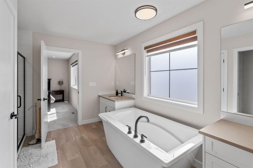 Upstairs, the spacious primary suite serves as a peaceful retreat, featuring a walk-in closet and a luxurious 5-piece ensuite complete with a soaker tub, standalone shower, and dual vanities. A large bonus room nearby offers additional living space—perfect for a family media room, homework zone, or home office. Two additional full-sized bedrooms, a well-appointed 4-piece bathroom, and a conveniently located laundry room round out the upper level.