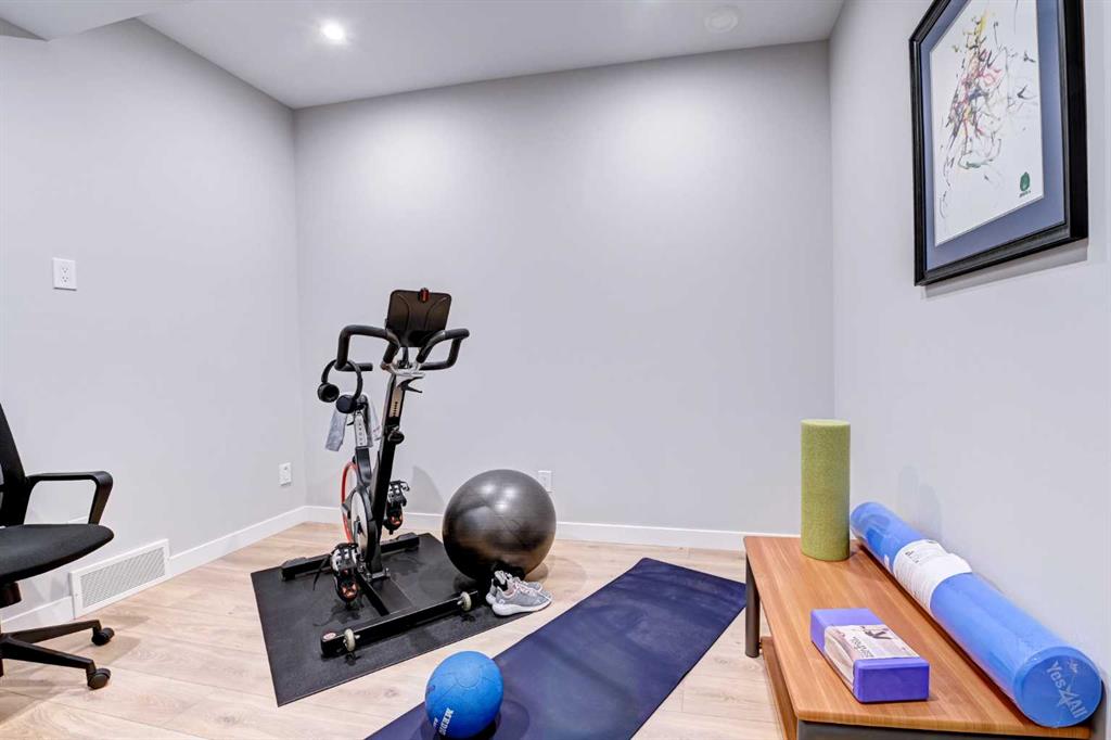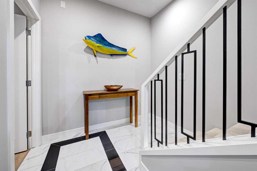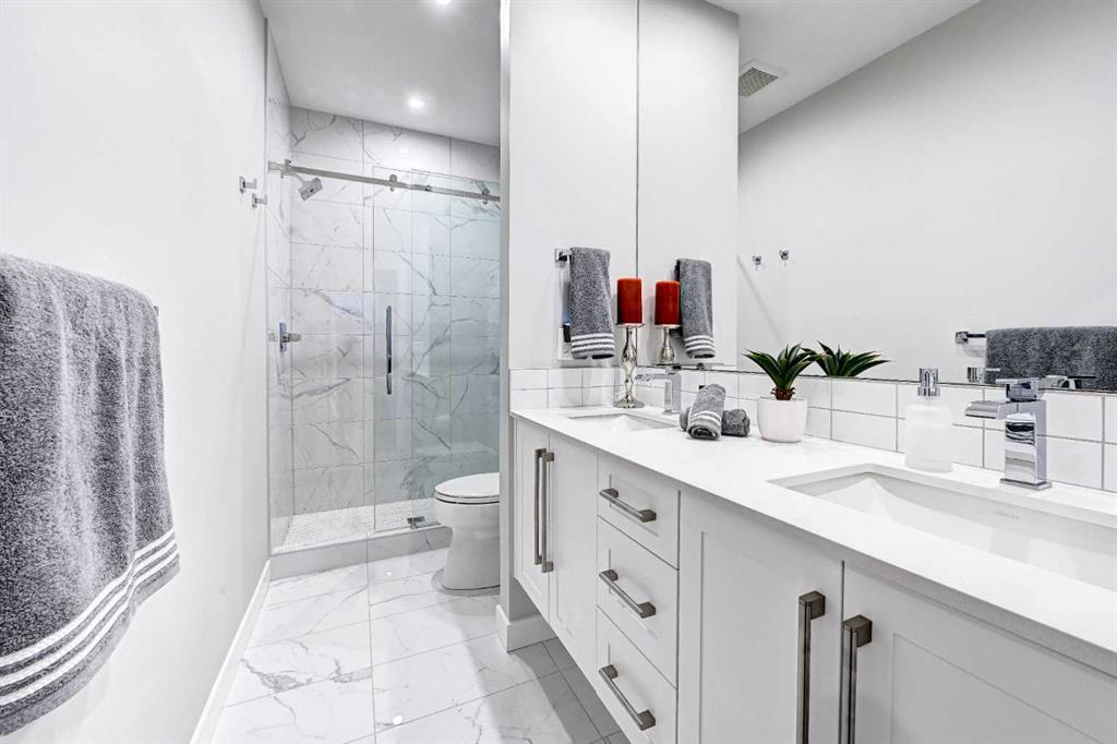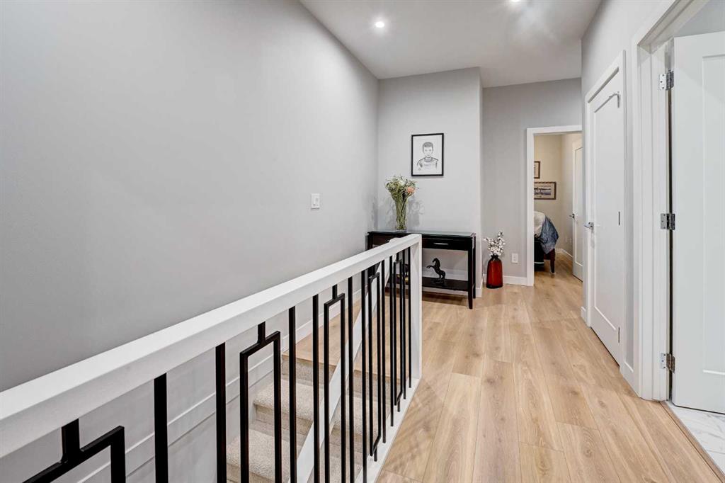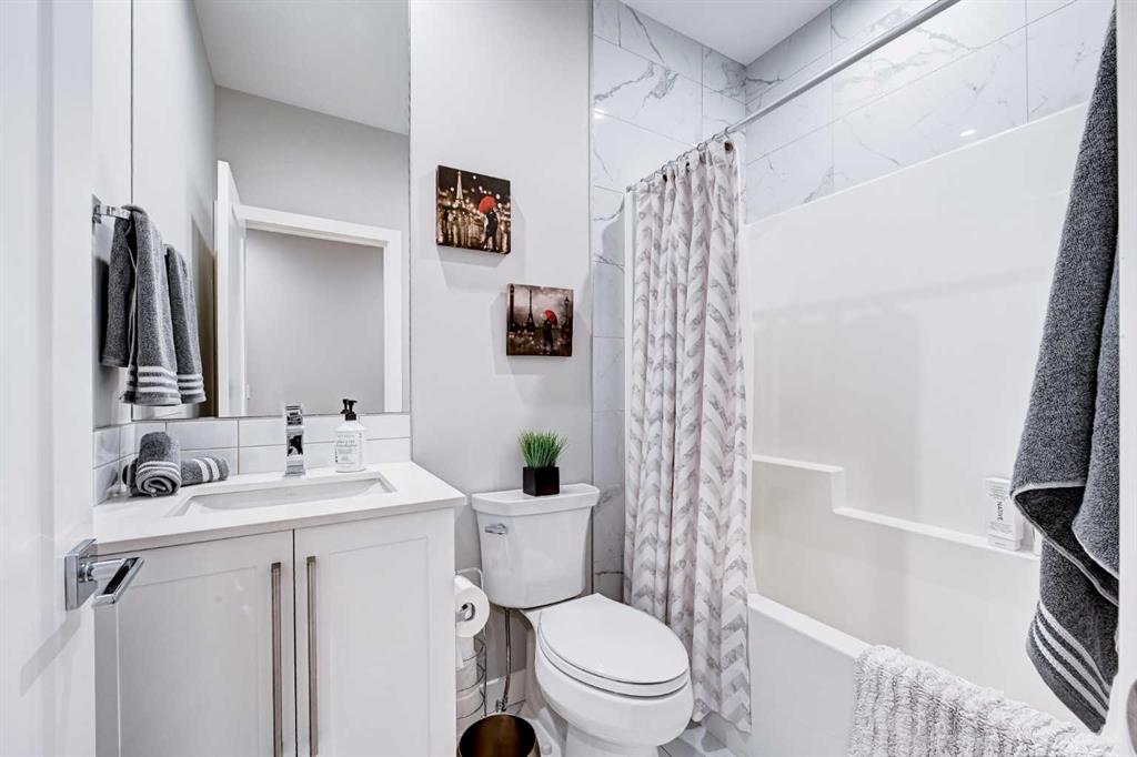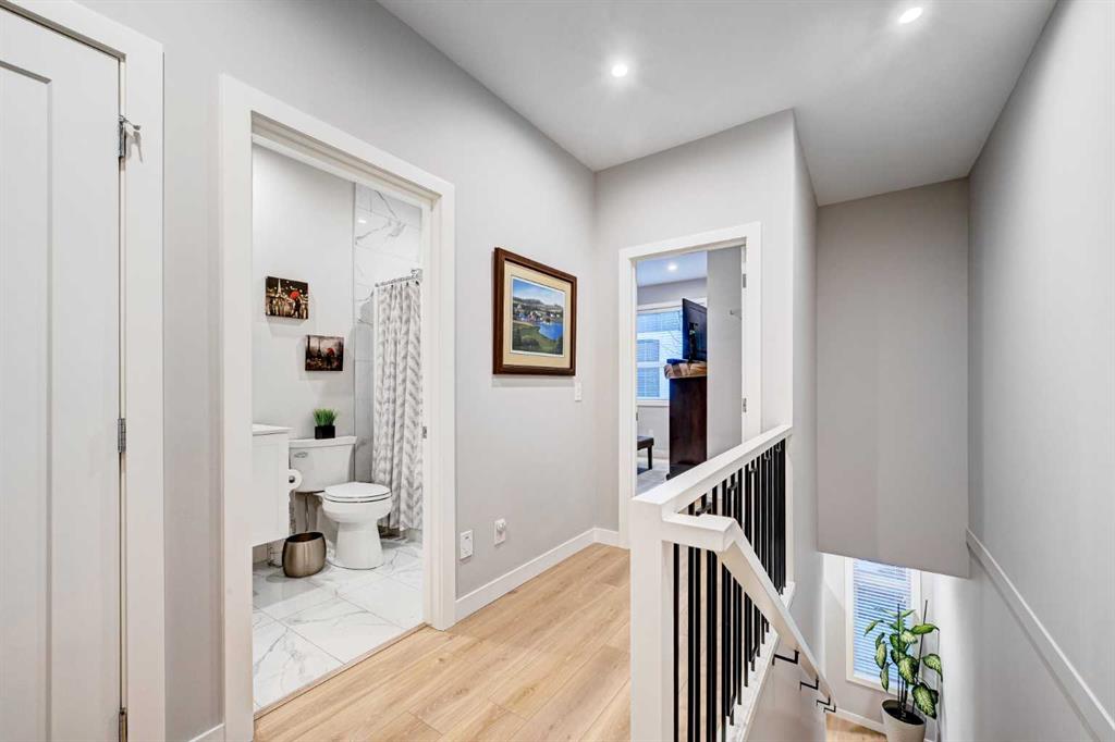 This modern, chic townhome offers 1,768 sq ft of beautifully developed space and is in impeccable condition with a thoughtfully designed floor plan and 9-ft ceilings on both the main and upper levels. The main floor is bright and wide open, highlighted by an expansive kitchen with a gas range, built-in fridge, and quartz countertops, flowing seamlessly into comfortable dining and living areas. Step outside to a spacious deck complete with a gas BBQ outlet—perfect for entertaining. Upstairs, you’ll find three generously sized bedrooms, including a primary retreat with a large walk-in shower and double sinks, plus the convenience of upper-floor laundry. The lower level adds valuable flexibility with an additional room ideal for a gym or home office. The double attached garage is insulated, heated, and finished with an epoxy floor, with all shelving included. This is also one of the rare units in the complex equipped with air conditioning. Located in West District—a vibrant and highly walkable community with a growing list of amenities, this home offers exceptional convenience. Enjoy nearby parks, including a dog park, walking paths, and quick access to Stoney Trail and Bow Trail for an easy commute anywhere in the city. Truly an exceptional home that is expected to sell quickly.